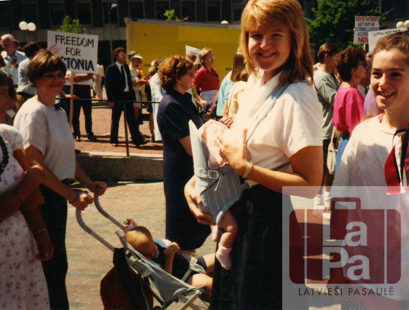 Baltiešu pretpadomju demonstrācija 50. gadadienā kopš Molotova-Ribentropa pakta pieņemšanas. 1989. gada 23. augustā Bostonā pie pilsētas valdes. No labās: Ilze Treimane, Rudīte Jansone ar jaundzimušo Kristu Jansoni.