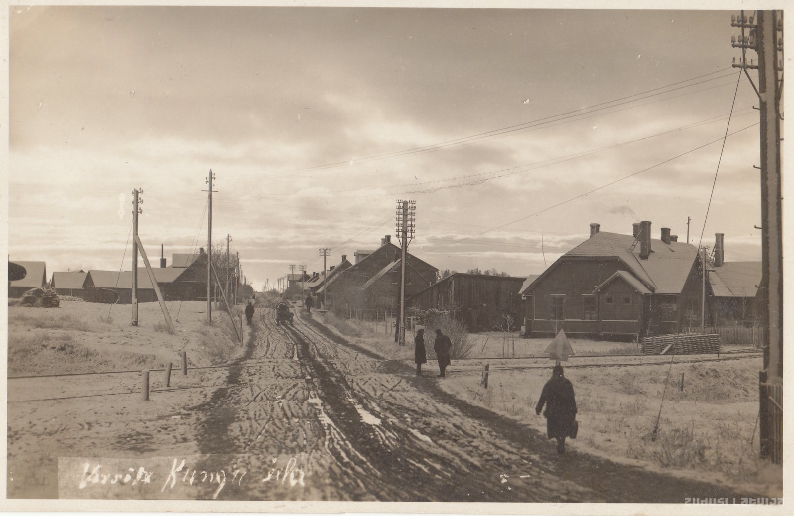 Kungu iela Viesītē ziemā. Labajā pusē redzama šaursliežu dzelzceļa Viesītes stacijas ēka
