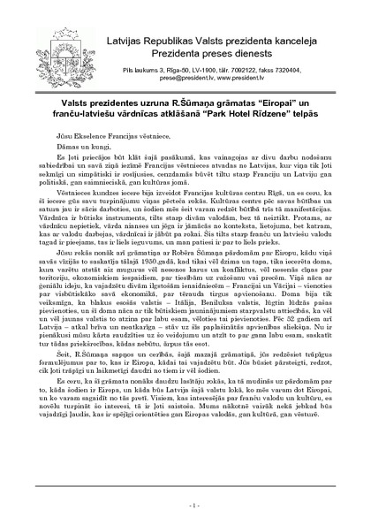 Valsts prezidentes uzruna R.Šūmaņa grāmatas “Eiropai” un franču-latviešu vārdnīcas atklāšanā “Park Hotel Rīdzene” telpās