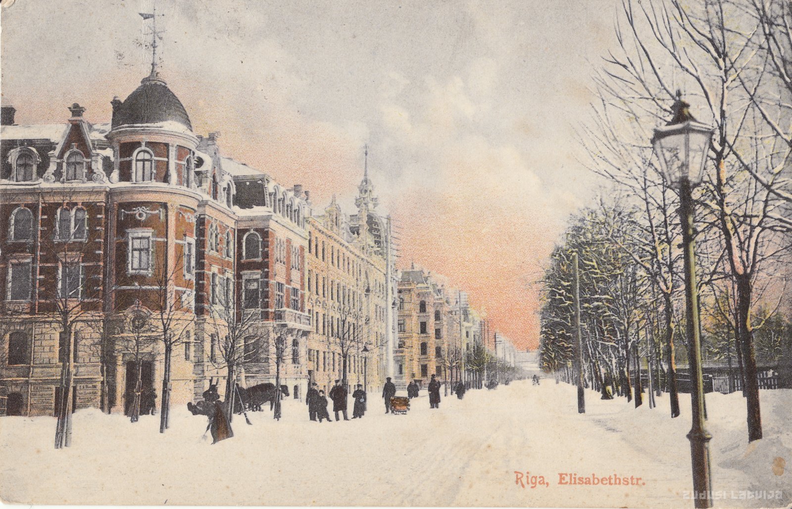 Elizabetes iela no Eksporta ielas puses. Priekšplānā - 1898.gadā celtā ēka Elizabetes un Ausekļa ielas stūrī, arhitekts Heinrihs Hilbigs. Četru stāvu mūra īres namu cēlusi kolēģijas asesora sieva Aleksandriņa fon Ercdorfs Kupfers dz. Okels [Aleksandrine Sophie von Ertzdof Kupfer geb. Ockel]