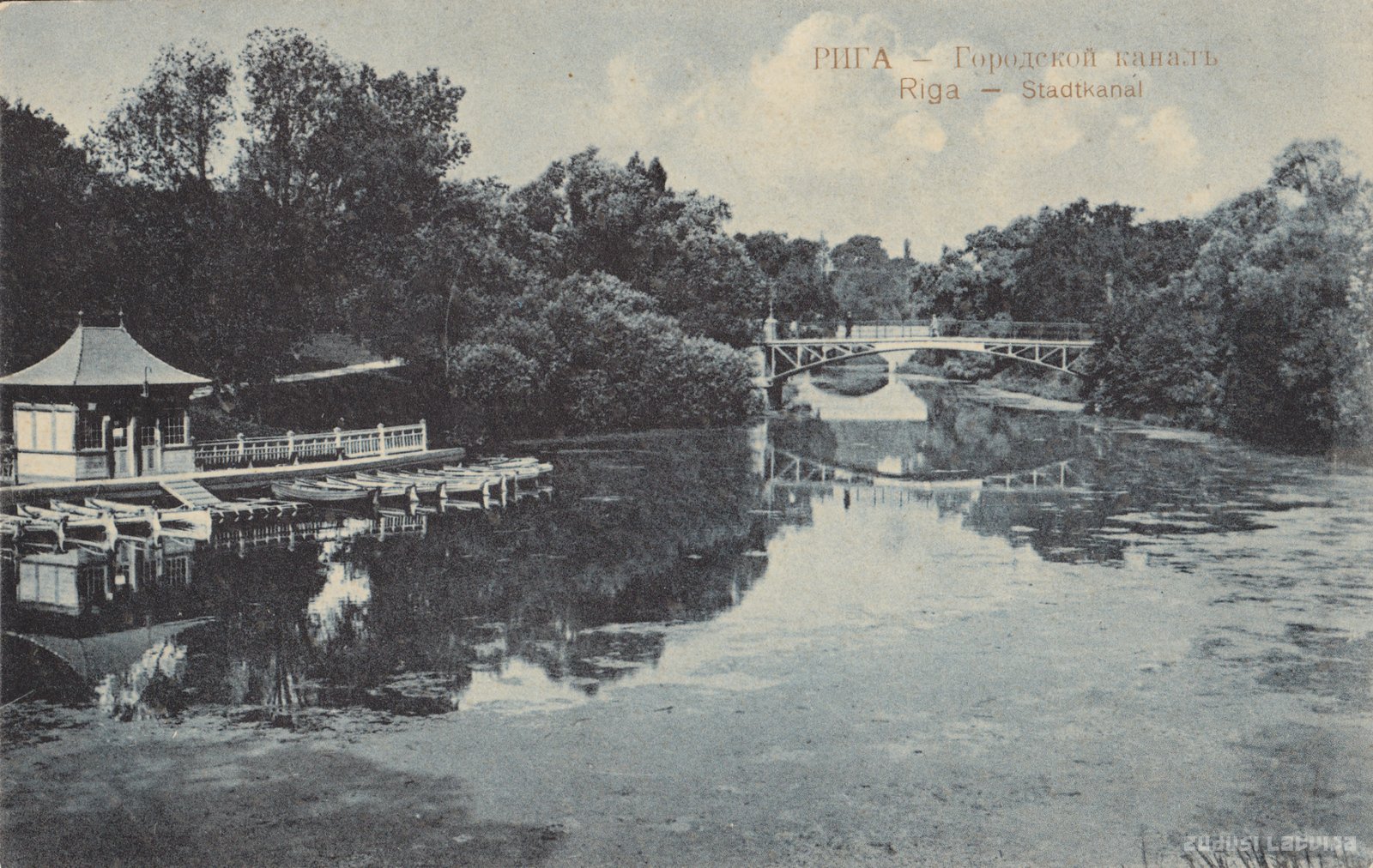 Pilsētas kanāls radies periodā no 1857. līdz 1863. gadam, kad nojauca viduslaikos ap Vecrīgu izveidoto nocietinājumu sistēmu. Kanāls veidojies no nocietinājumu sistēmā ietilpstošā aizsarggrāvja, to daļēji aizberot. Tā novietojums plānā atbilst kādreizējai nocietinājumu sistēmas kontūrai. Gar kanālu izveidota 200 līdz 250 metru plata apstādījumu josla, kas 1880. gadā pēc pilsētas galvenā dārznieka G. Kufalta projekta rekonstruēta. Kājnieku satiksmei pār kanālu tā apstādījumos 19. gadsimtā uzbūvēti vairāki tilti. Divi no tiem, neizmainot ārējo veidolu, saglabājušies līdz šodienai. Vecākais no tiem ir 1892. gadā pēc vācbaltu inženiera Ā. Agtes projekta uzbūvētais tilts pār kanālu pie Bastejkalna. Šī tilta rekonstrukcijas un atjaunošanas darbi veikti 1994. gadā. Kreisajā pusē redzama laivu namiņš un piestātne, kas nav saglabājusies mūsdienās