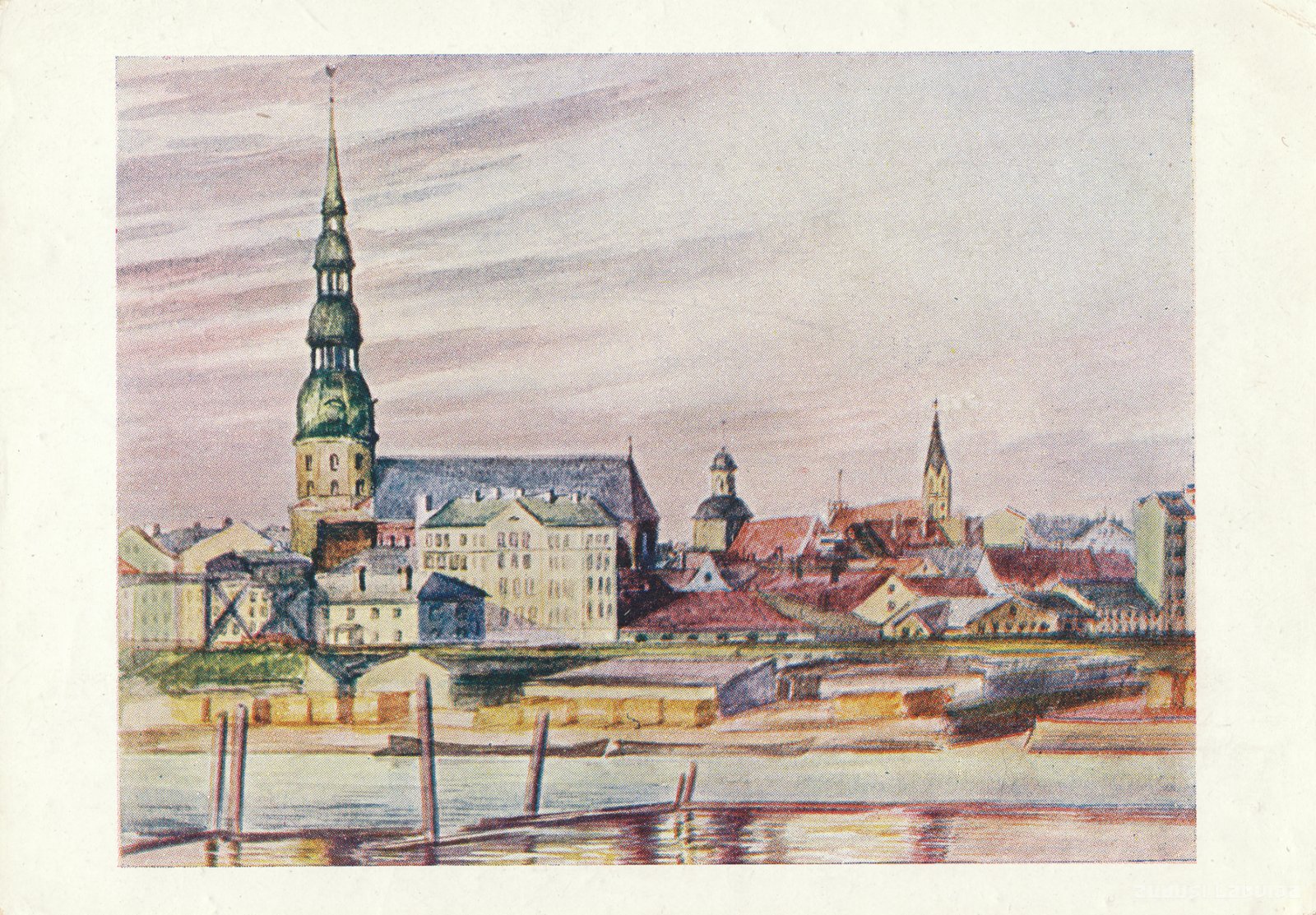 Otrā pusē teksts: Mākslas pastkarte - Künstler –Postkarte - Carte postale artistique – Art Post-card. 2. sērija N.Koslow, Nr.8. Skats uz Rīgu no straumes augšgala. Riga von oberhalb des Stromes. Riga, vue du fleuve . Riga seen from above the river. Grāmatu spiestuves un apgādniecības akc.sab. „R.Ruetc&Co”, Rīgā, Doma laukumā 5.