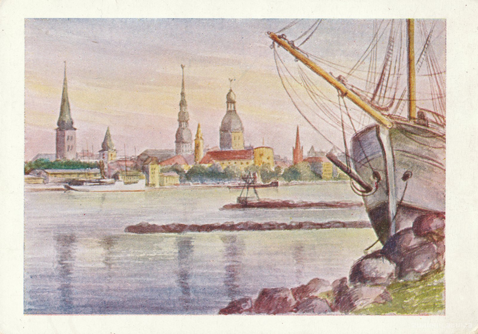 N.Koslova mākslas pastkarte Nr.7. attēlo Rīgu, raugoties no Ķīpsalas puses