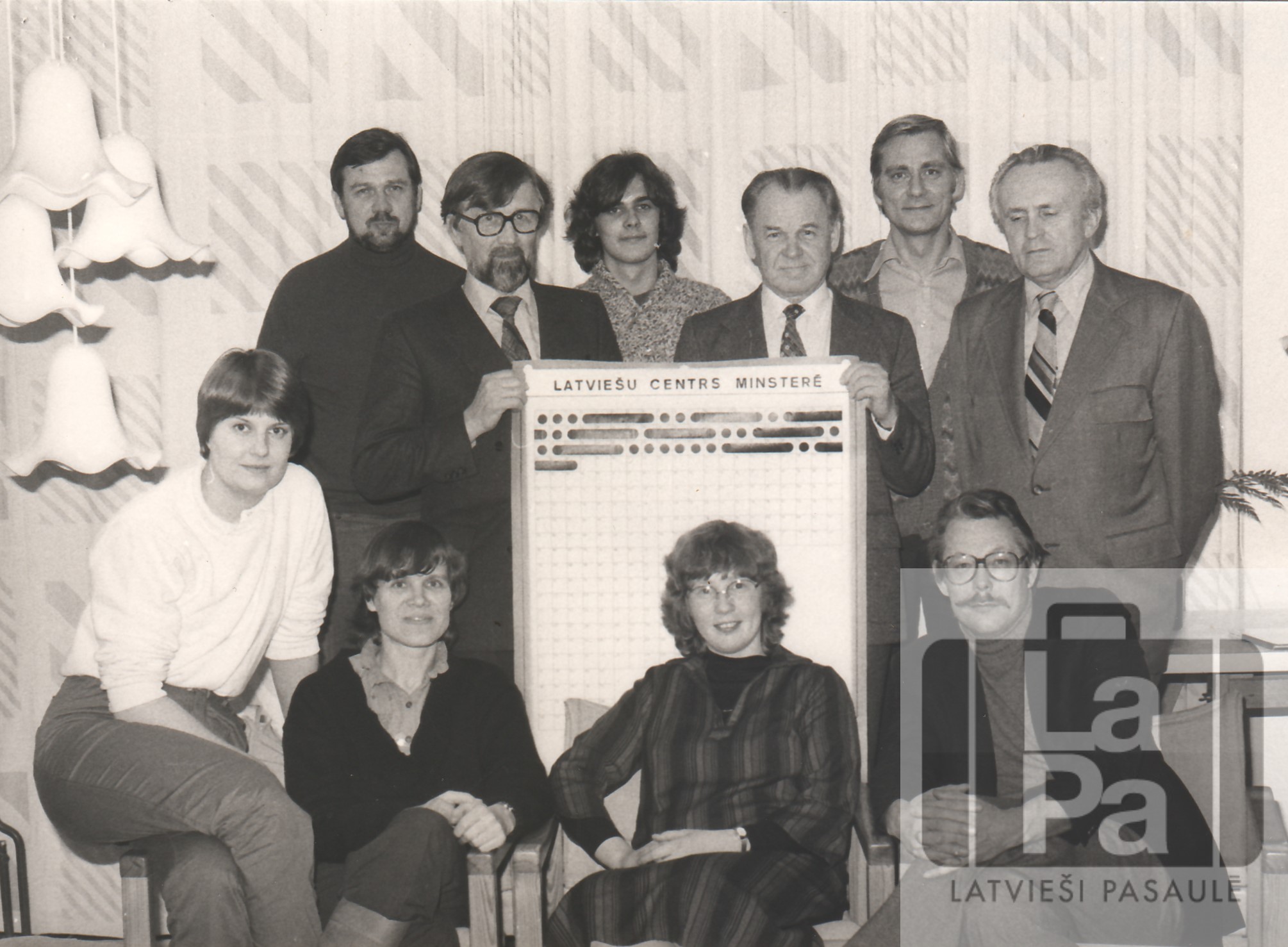 LCM pirmā valdes sēde 1982. gada 11. februārī Maijas Gobiņas mājā. Pirmā rindā no kreisās: Anna Muhka, Maija Gobiņa, Dace Sondore, Andris Kadeģis, Otrā rindā no kreisās: J. Trauciņš, G. Graudiņš, Andrejs Neimanis, A.J. Bērziņš, M. Zandbergs un A. Liepkalns.