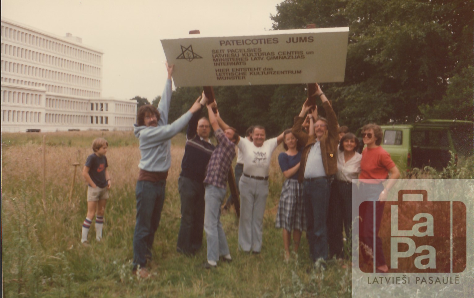 Plakāta uzstādīšana pie Latviešu centra Minsterē apbūves gabala 1984. gada jūlijā.