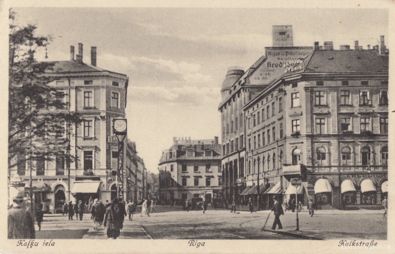 Kaļķu ielas nosaukums dokumentos ir saglabājies jau no 1407. gada. Savu nosaukumu iela saglabāja līdz pat 1950. gadam, kad tā kopā ar Brīvības bulvāri, ielu un gatvi tika pievienota Ļeņina ielai. Savu vēsturisko nosaukumu un garumu tā atguva 1990. gadā. Kaļķu iela kopā ar tās turpinājumu, Brīvības ielu, ir 13 km gara. Kreisajā pusē redzams nams Aspazijas bulvārī1, 19. gadsimtā 2. pusē Aspazijas bulvārī atradās viesnīca "Bellevue". 20. gadsimta sākumā līdz 1940. gadam šajā namā darbojās Romas viesnīca un Operas kafejnīca, kuras īpašnieks bija Otto Švarcs. Tagad tajā vietā atrodas jaunā viesnīca "Hotel de Rome"