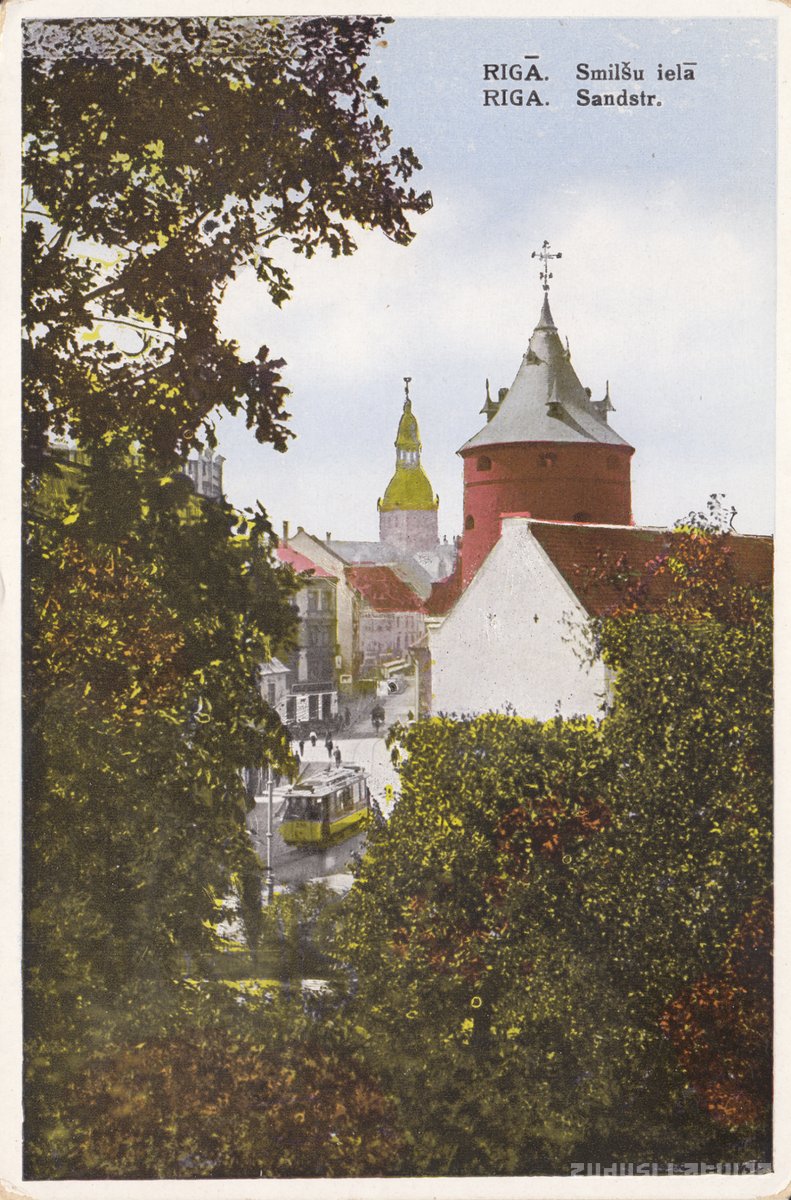 Smilšu iela no Bastejkalna. Atklātnē akcentējas Smilšu tornis (Pulvertornis), Svētās Māras jeb Doma baznīca. Kā redzams, tajā laikā pa Smilšu ielu bijusi tramvaju satiksme. Smilšu iela ir viena no Rīgas vecākajām ielām. 13.-17.gs. bija Rīgas nozīmīgākā un platākā iela, tā bija Smilšu ceļa turpinājums pilsētā. Viduslaikos Smilšu ielā atradās divas publiskās akas. Iela sākās pie pilsētas aizsargmūrī esošajiem Smilšu vārtiem, kam līdzās atradās Smilšu tornis. 1639. gadā vārtus un galveno ieeju Rīgā pārvietoja uz Kaļķu ielu. Ielas apbūvi tagad veido galvenokārt 19.gs. beigās un 20.gs. sākumā celtās ēkas. Ielas garums ir 280 metri