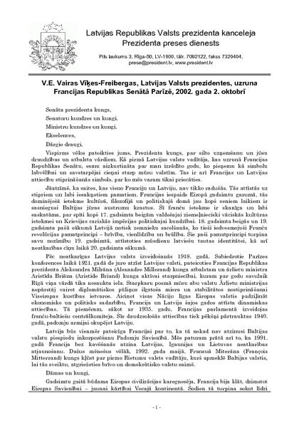 V.E. Vairas Vīķes-Freibergas, Latvijas Valsts prezidentes, uzruna Francijas Republikas Senātā Parīzē, 2002. gada 2. oktobrī