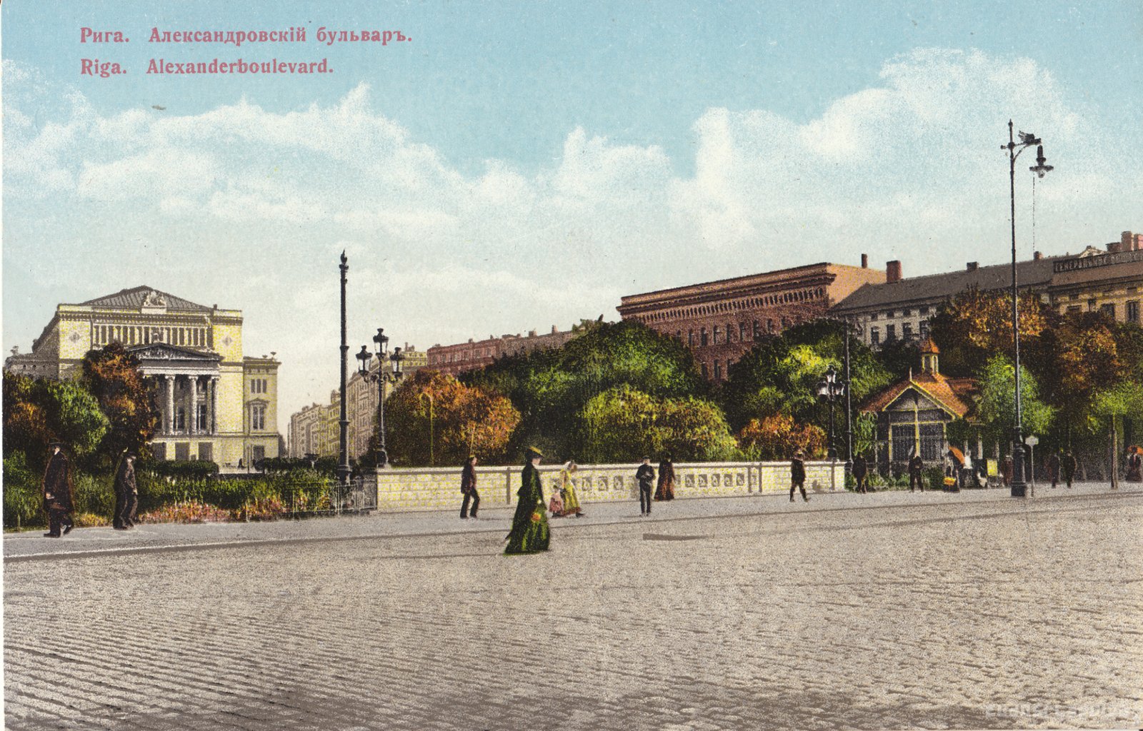 Atklātnes frontālajā pusē teksts: Рига.Александровскiй бульварь.Riga. Alexanderboulevard. Otrajā pusē: Акц.О-во Грандбергь вь Стокгольмь.5