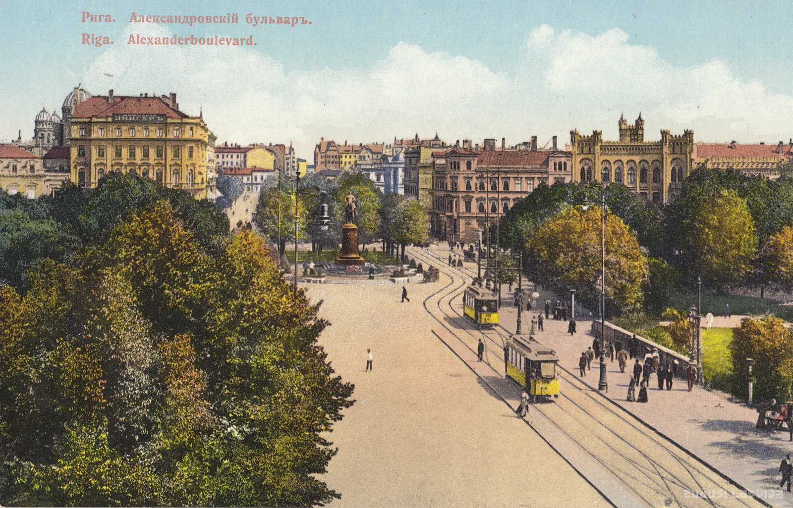 Rīgas priekšpilsētas centrālā iela pēc 1754. gada zīmētā plāna bija Lielā Smilšu iela, ko sauca arī par Lielo Smilšu ceļu. Tā sākās no pilsētas nocietinājumiem un sniedzās līdz Lielajai Kalēju ielai (tagad Ģertrūdes iela) un beidzās pie Raunas vārtiem. Pēc 1815. gada, kad pārplānoja 1812. gadā nodedzināto priekšpilsētu, paplašināja Esplanādi līdz Elizabetes ielai, aiz kuras sākās apbūves teritorija. Lielā Smilšu iela ieguva jaunu trasi, kas sakrīt ar tagadējo Brīvības ielu posmā no Elizabetes ielas līdz Gaisa tiltam. 1818. gadā ielas galā atklāja Triumfa arku, ko nosauca par Aleksandra vārtiem un pēc tam arī ielu pārdēvēja par Aleksandra ielu, kas 19. gadsimta pirmajā pusē bija vistālāk apbūvētā iela. Pēc vaļņu nojaukšanas 1859. gadā, Aleksandra ielu pagarināja līdz Pilsētas kanālam un 1861. gadā nosauca par Lielo Aleksandra ielu. Laika posmā no 1870. līdz 1876. gadam Lielās Aleksandra ielas posmu no Pilsētas kanāla līdz Elizabetes ielai nosauca par Aleksandra bulvāri.(Vikipēdija) Aleksandra bulvāris veidojies pilsētas nocietinājumu norakšanas laikā, pagarinot Aleksandra (tagad Brīvības) ielu no Elizabetes ielas līdz Kaļķu ielas galam. Aleksandra bulvārī bija dzīva satiksme. Pa to diendienā kursēja 2. un 3. līnijas tramvaji. Zirgu tramvaji Rīgas ielās parādījās jau 1882. gadā, bet 1901. gadā tos nomainīja eletriskie tramvaji. Atklātnes vidusdaļā redzams piemineklis Pēterim I