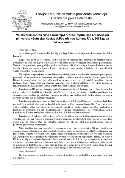Valsts prezidentes runa akreditējot Kipras Republikas ārkārtējo un pilnvaroto vēstnieku Kostas A.Papademas kungu, Rīga, 2002.gada 24.septembrī