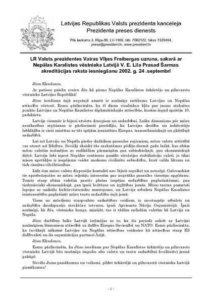 LR Valsts prezidentes Vairas Vīķes Freibergas uzruna, sakarā ar Nepālas Karalistes vēstnieka Latvijā V. E. Lila Prasad Šarmas akreditācijas raksta iesniegšanu 2002. g. 24 .septembrī