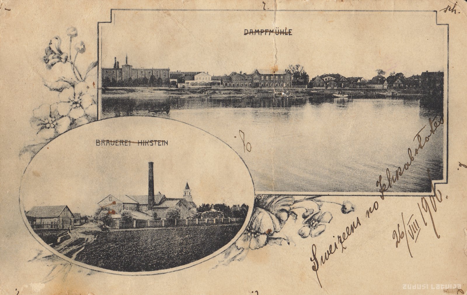 Frontālajā pusē teksts: Brauerei Hikstein, Dampfmühle. Otrajā pusē zīmogs ar datējumu 1906. gada 26.augusts