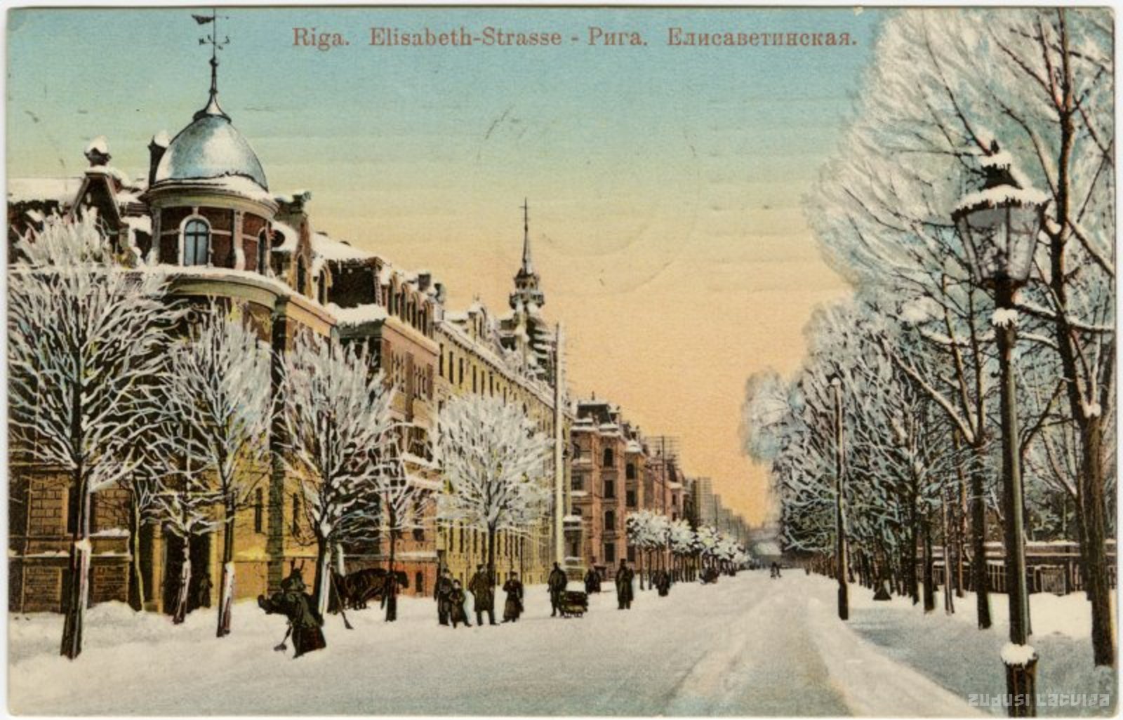 Attēla kreisajā pusē nams Elizabetes ielā Nr. 7. Īres nams celts 1898. gadā pēc arhitekta H.O.Hilbiga projekta, bijušais fon Ercdorfa-Kupfera (von Ertzdorff-Kupffer) nams