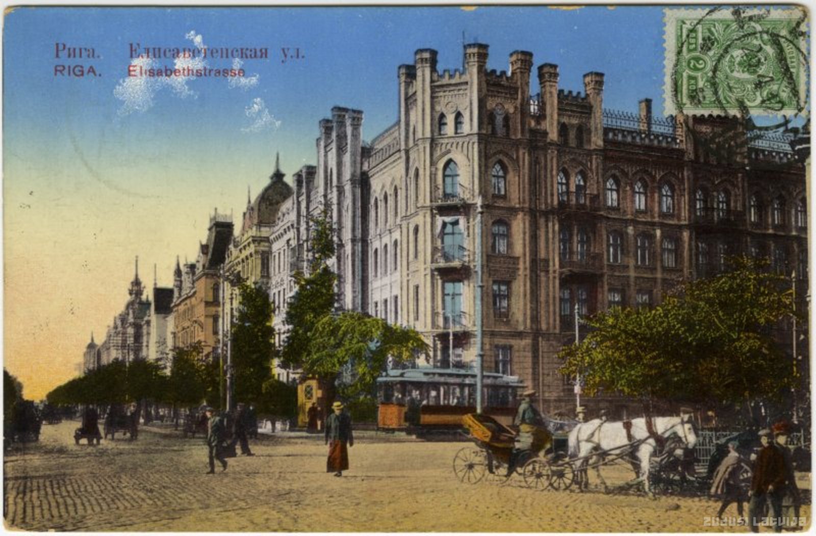 Priekšplānā nams Elizabetes ielā 21, Pulkveža Brieža ielā 1. Īres nams celts 1883.-1884. gadā, inženiera E. fon Trompovska projekts; bijušais barona fon Tīzenhauzena (von Tiesenhausen) nams, vēlāk viņa mantinieku īpašums