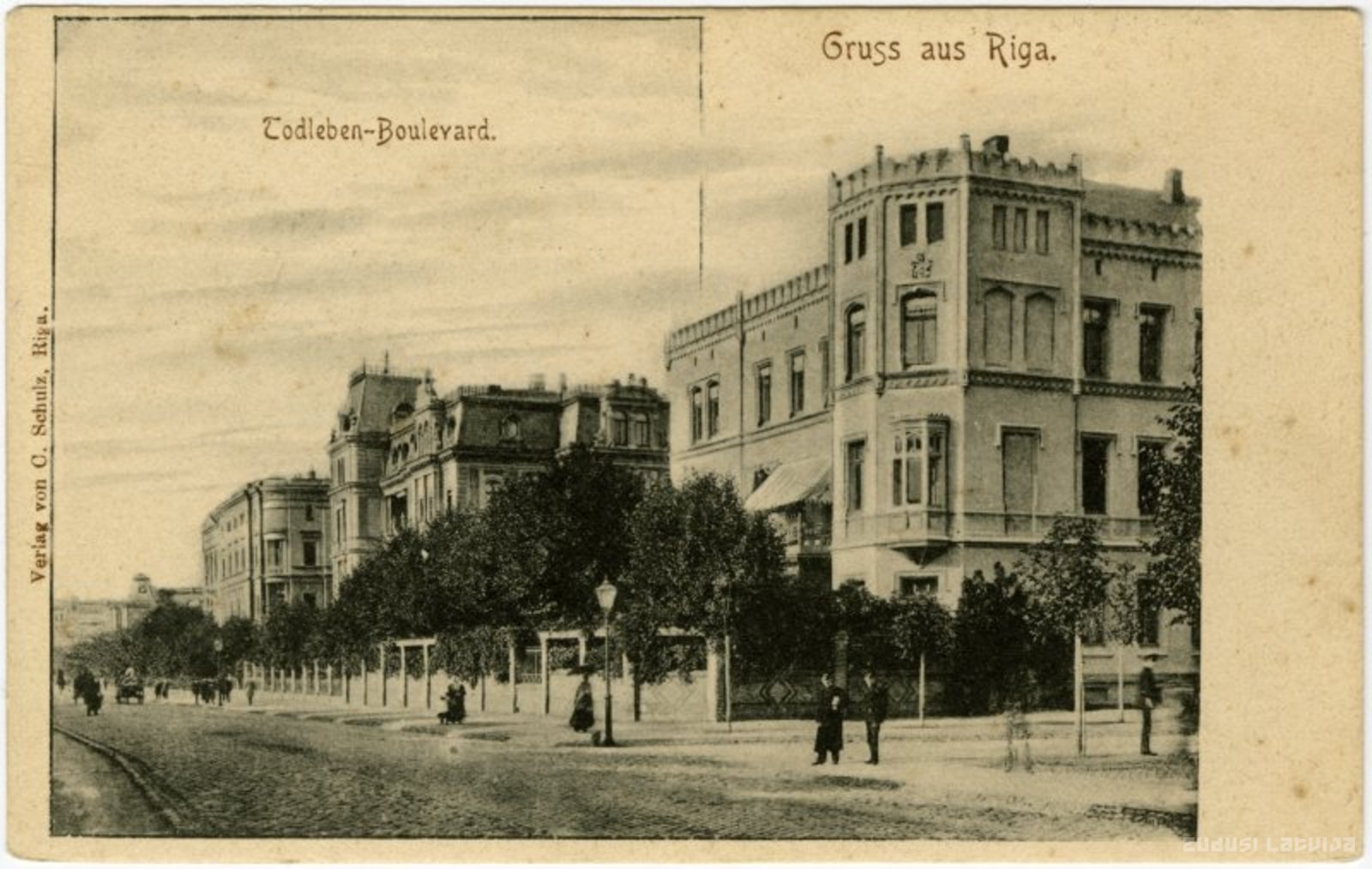 Priekšplānā nams Jura Alunāna [agrāk Georga] ielā Nr. 1. Trīs stāvu mūra savrupmāju cēlis Rīgas rātskungs Emīls Barons fons Bēttihers [Boetticher] pēc arhitekta Fridriha Jeleja 1872. gadā apstiprināta projekta