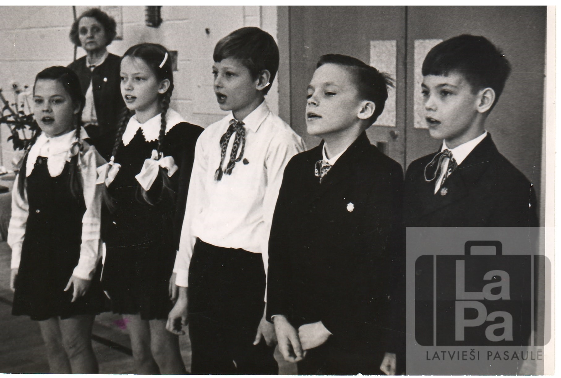 Draudzīgais aicinājums Toronto Latviešu biedrības Sestdienas skolā. Uzraksts fotogrāfijas otrā pusē: Pa labi – M. Lorbergs sveicot skolas saimi iepazīstina skolēnus un vecākus ar latv. laikrakstu lielo nozīmi mūsu dzīvē. Pa kreisi – 4. kl. audzēkņi deklamē N. Kalniņa "Mātes valodiņu". Sandra Ķuze, Gundega Ozoliņa, Valdis Martinsons, Alberts Zubāns un Tālis Briedis.