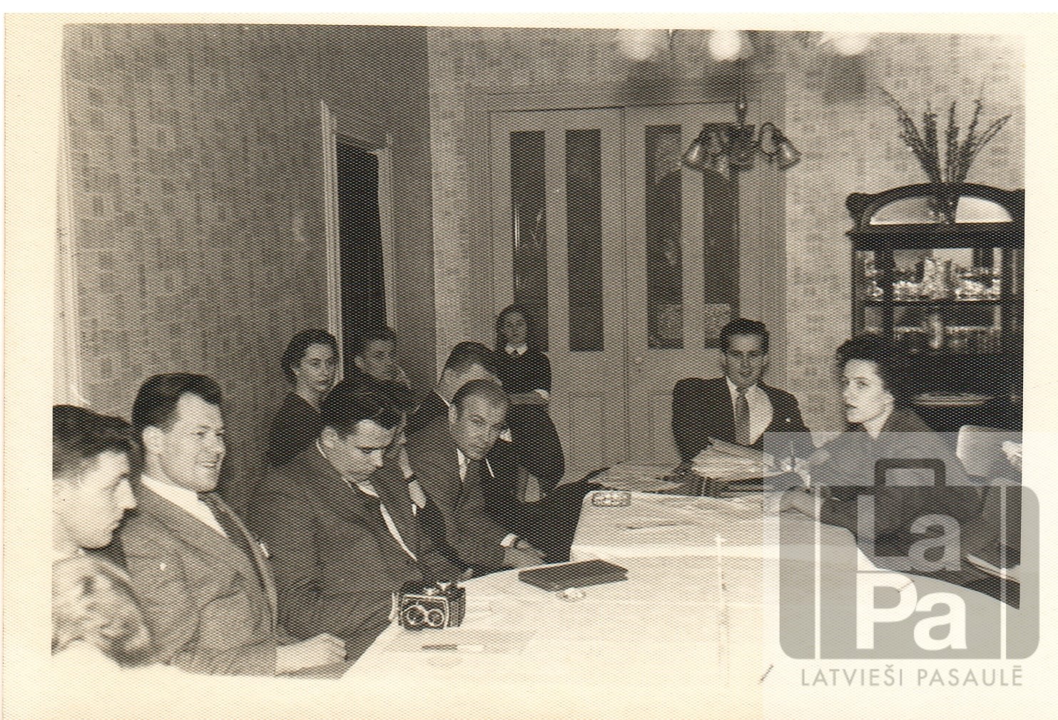 Latviešu nacionālā jaunatnes apvienība Kanādā (LNJAK) 1953. gadā. Sēž ap galdu no kreisās: nezināms, Andris Priedītis, Valdis Zariņš, Boriss Gajevskis, Tālis Kronbergs, Vera Pētersone.