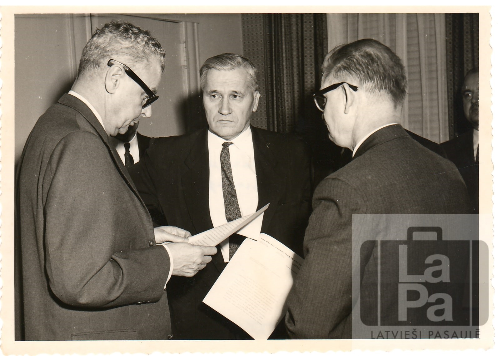 Kanādas Ministru prezidents pieņem un pārlasa iesniegto rakstu. No kreisās: Džons Dīfenbeikers (John Diefenbaker), Ādolfs Svenne, Viktors Upeslācis.