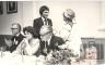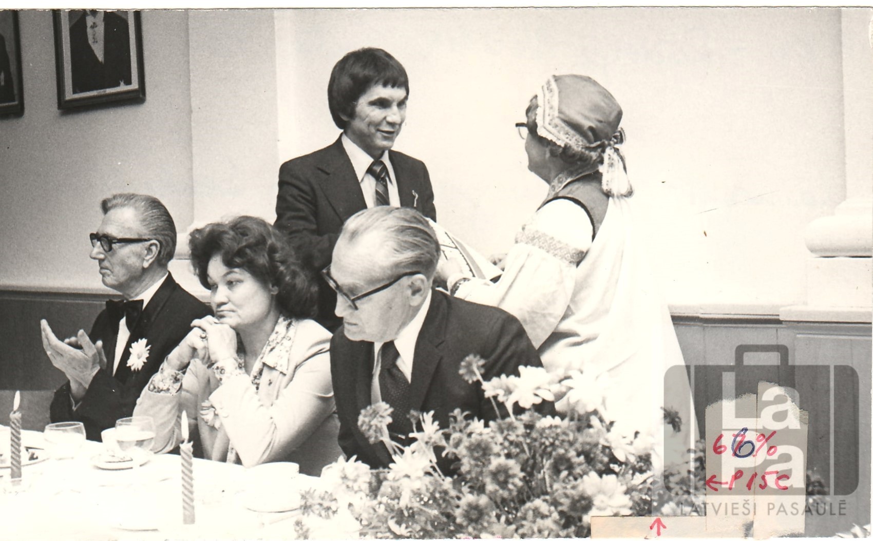 Biruta Senkēviča apsveic Laimoni Zandbergu. Sēž Rūdolfs Norītis, Inta Purva, nezināms.