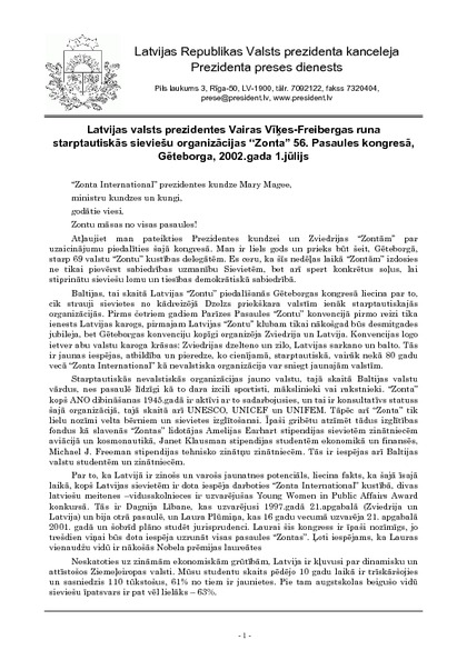 Latvijas valsts prezidentes Vairas Vīķes-Freibergas runa starptautiskās sieviešu organizācijas “Zonta” 56. Pasaules kongresā, Gēteborga, 2002.gada 1.jūlijs
