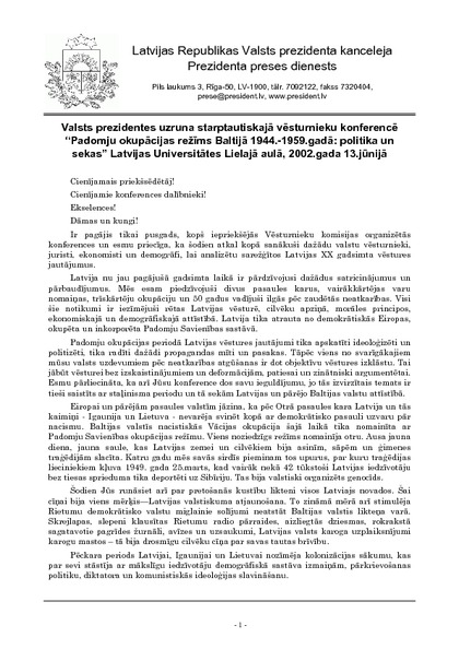 Valsts prezidentes uzruna starptautiskajā vēsturnieku konferencē “Padomju okupācijas režīms Baltijā 1944.-1959.gadā: politika un sekas” Latvijas Universitātes Lielajā aulā, 2002.gada 13.jūnijā