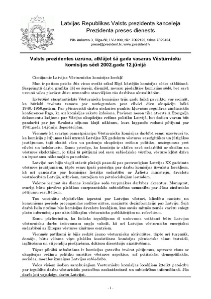 Valsts prezidentes uzruna, atklājot šā gada vasaras Vēsturnieku komisijas sēdi 2002.gada 12.jūnijā