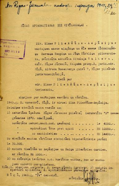 1943. gada 15. decembrī sastādīts pārskats par Aspazijas atstātā mantojuma sastāvu un vērtību