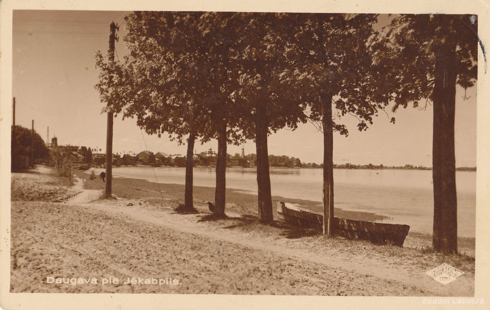 Atklātnes frontālajā pusē uzraksts Daugava pie Jēkabpils un fotodarbnīcas spiedogs: Fotobrom Rīgā. Otrajā pusē teksts igauņu valodā ar datējumu 1935. gada 24. augustā