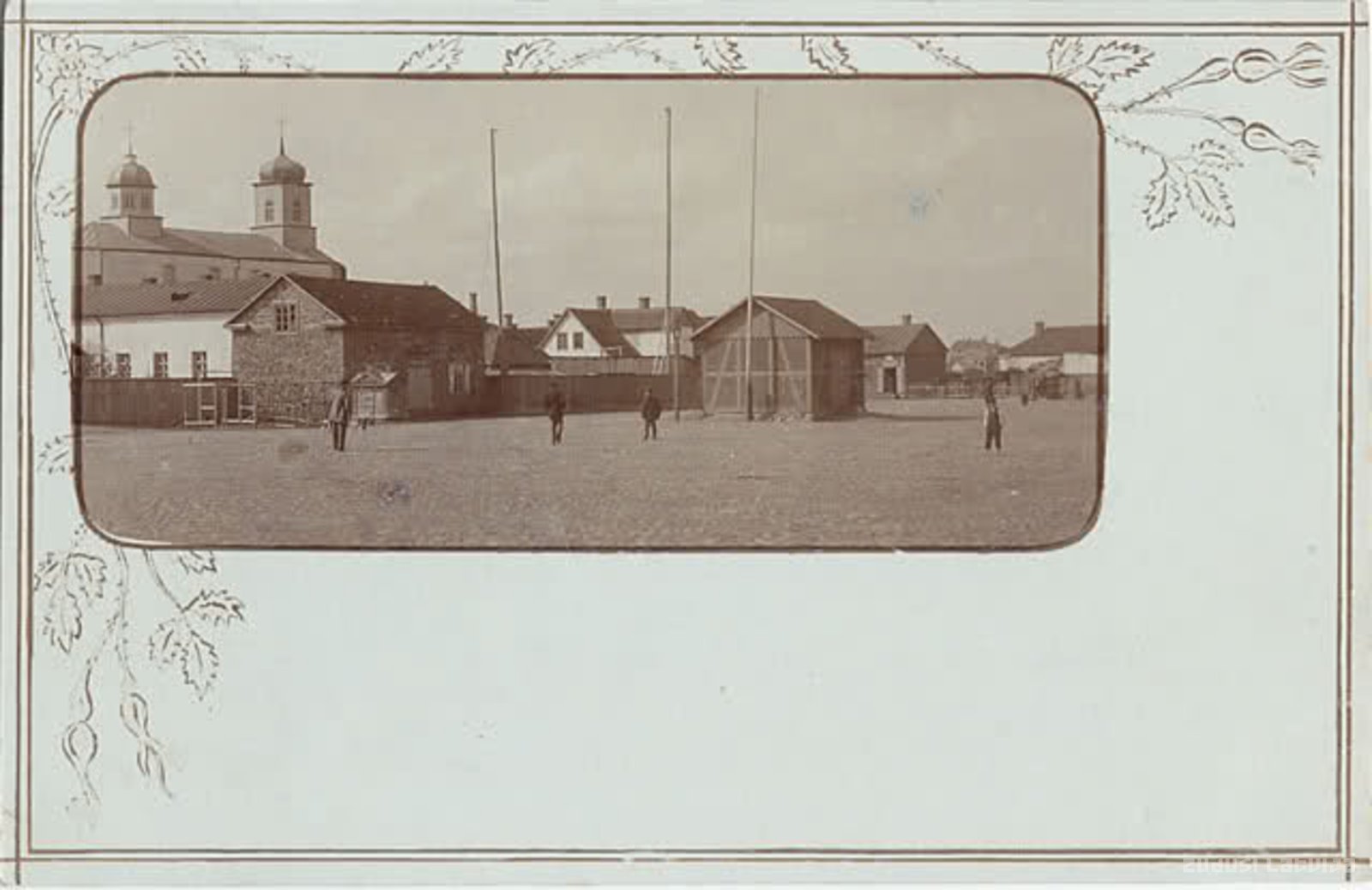 Piektdienas tirgus laukums (mūsdienās Vecpilsētas laukums). Kreisajā pusē redzams Pokrova draudzes sieviešu klosteris, tā celles ēka, vēlākais pirmais Aizsargu nams pilsētā, aiz tā Uniātu baznīca (mūsdienās Vissvētās Dievmātes patvēruma pareizticīgo baznīca). Pastkartes centrā redzama Svaru māja