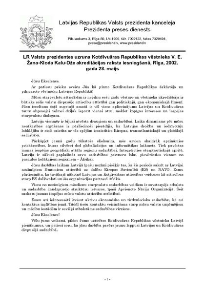 LR Valsts prezidentes uzruna Kotdivuāras Republikas vēstnieka V. E. Žana-Kloda Kalu-Dže akreditācijas raksta iesniegšanā, Rīga, 2002. gada 28. maijs
