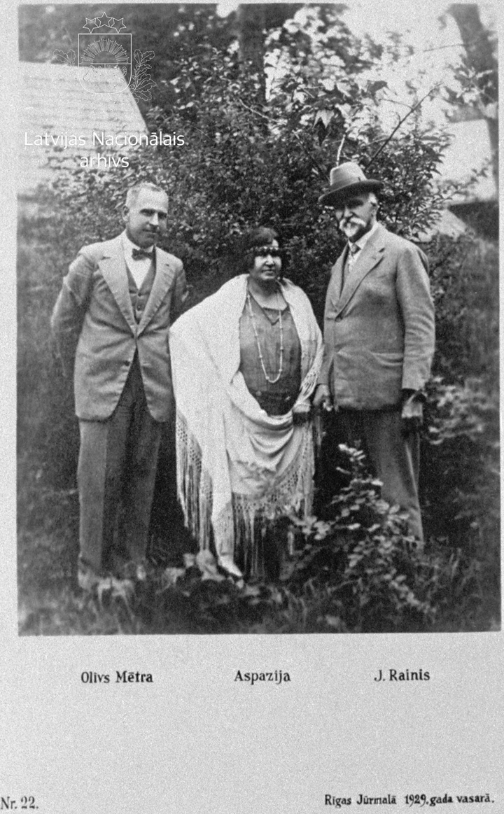 Rainis, Aspazija un dziedātājs, komponists, skolotājs Olīvs Mētra (īstajā vārdā Jānis Antons Ķiploks) Majoru vasarnīcas dārzā 1929. gada 23. augustā.