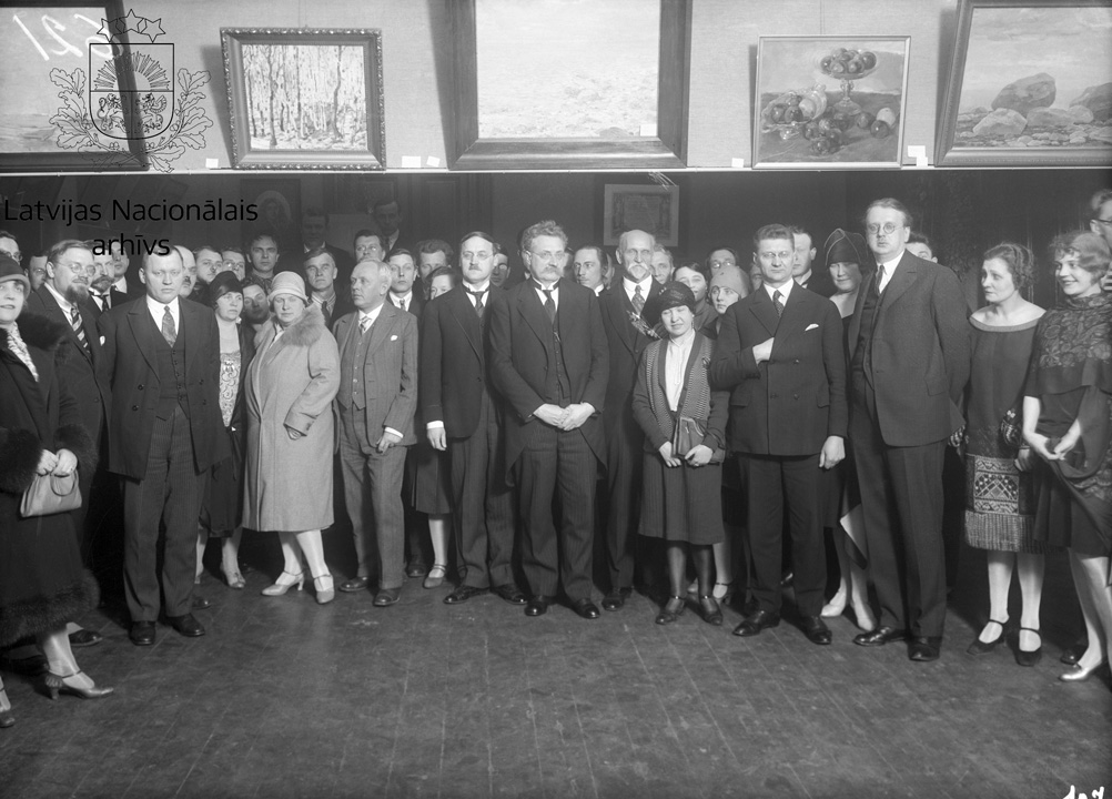 Sabiedrisko darbinieku grupa mākslas izstādē Dailes teātrī. No labās puses: Kaupiņš, Rūdolfs Egle, Rainis, Augusts Tentelis.