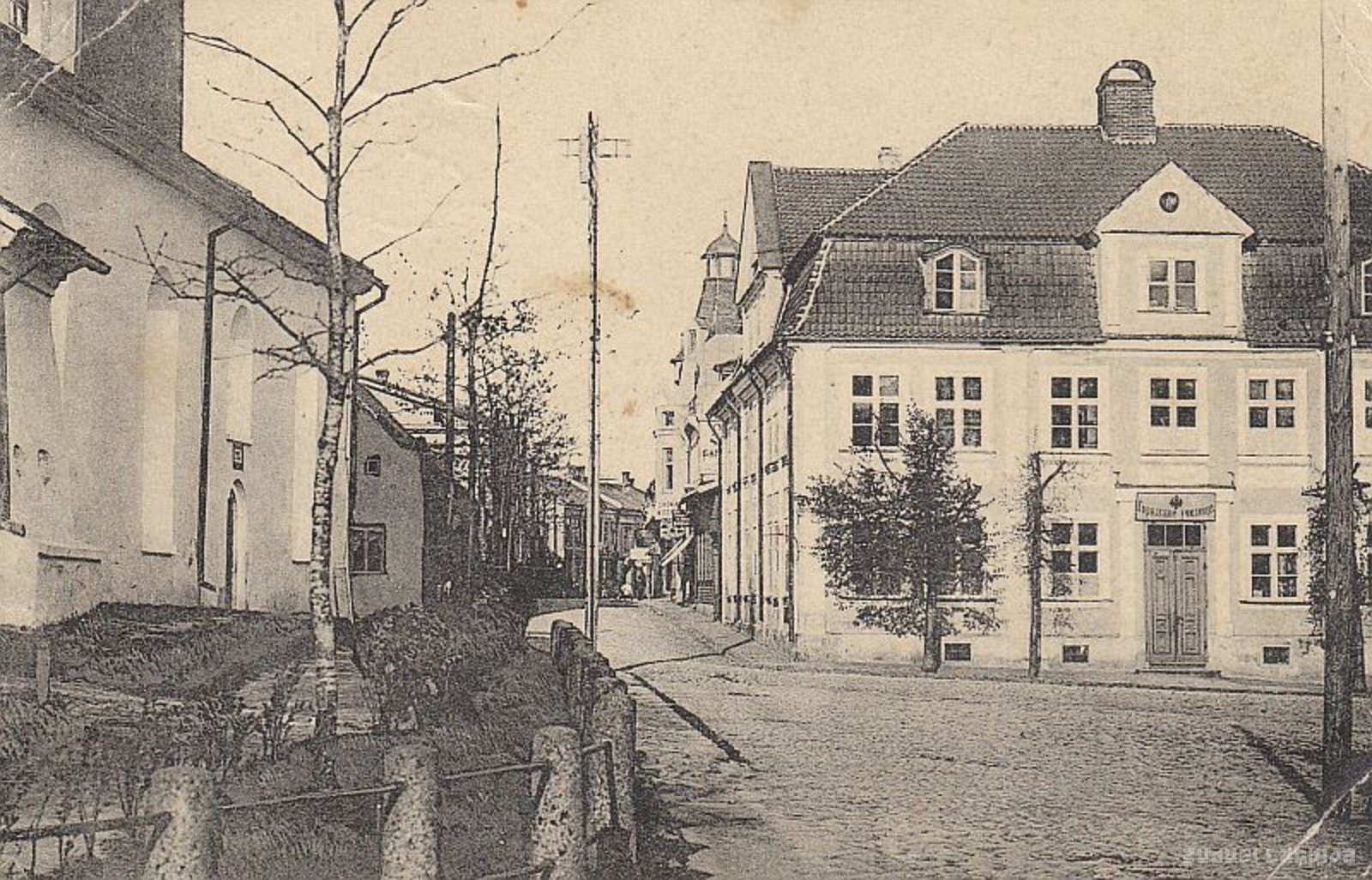 Kreisajā pusē Sv. Sīmaņa luterāņu baznīca. Blakus kokrūpnieka J. Ābeltiņa nams ar tornīti - Livonijas viesnīca, nākošie divi H. Grasmaņa dzimtas īpašumi