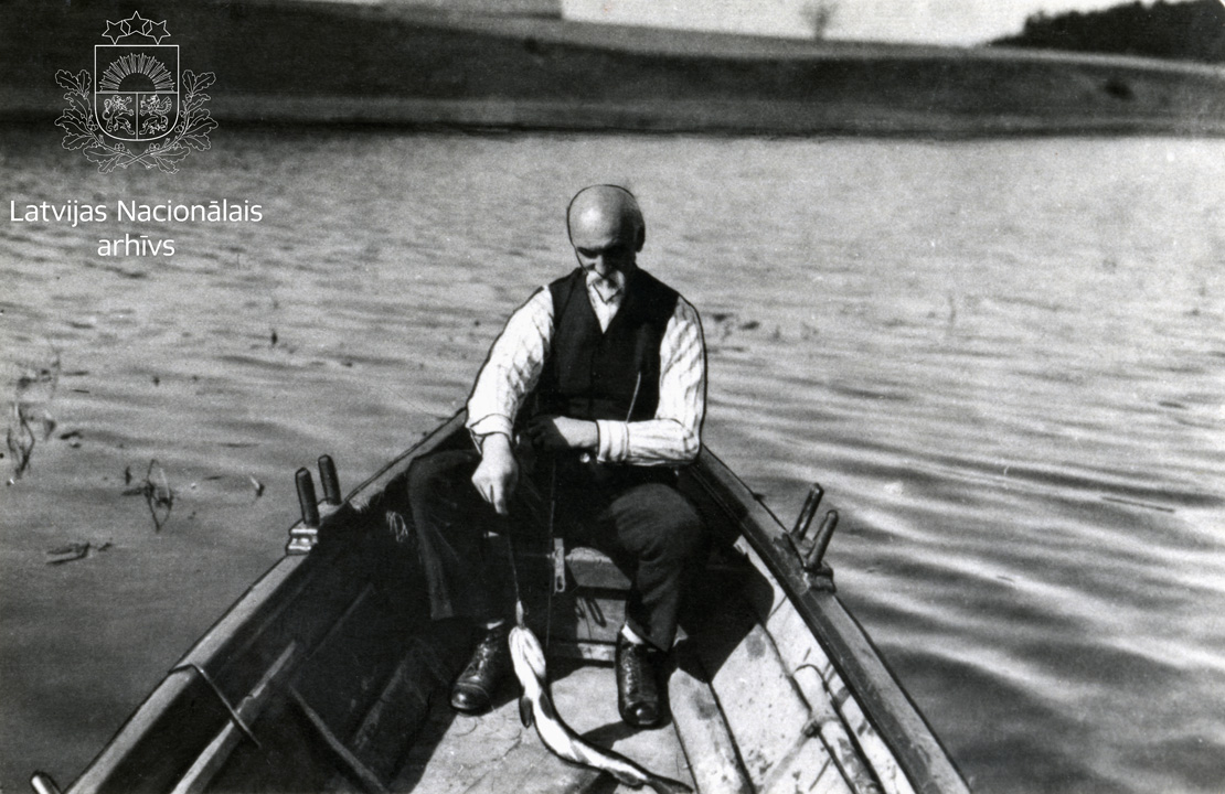 Rainis ar izzvejotu līdaku. Iespējams, Mežamuižas ezers. Dažos avotos kā autors norādīts Vilis Rīdzenieks.