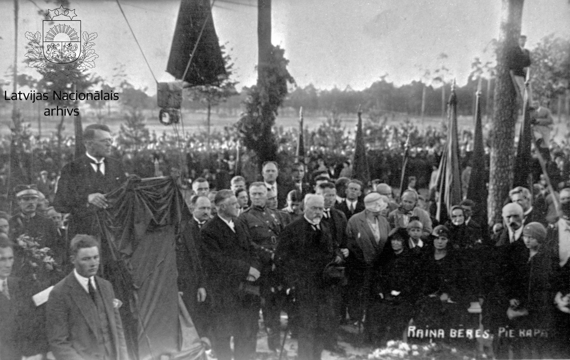 Raiņa bēres. Uzstājas Fēlikss Cielēns, pavadītāju vidū: Jānis Balodis, Valsts prezidents Gustavs Zemgals, Ansis Rudevics, Fricis Menders, sēž Aspazija.