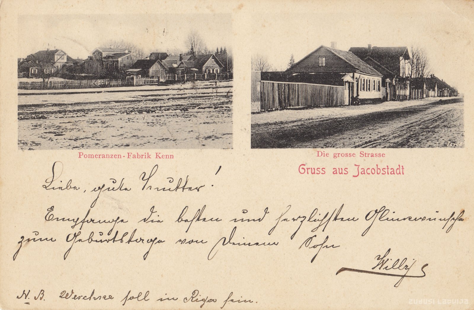 Atklātnes priekšējā pusē redzami uzraksti Gruss aus Jacobstadt. Pomeranzen-Fabrik Kenn un Die grosse Strasse. Otrā pusē pasta zīmogs 17.10.1901.