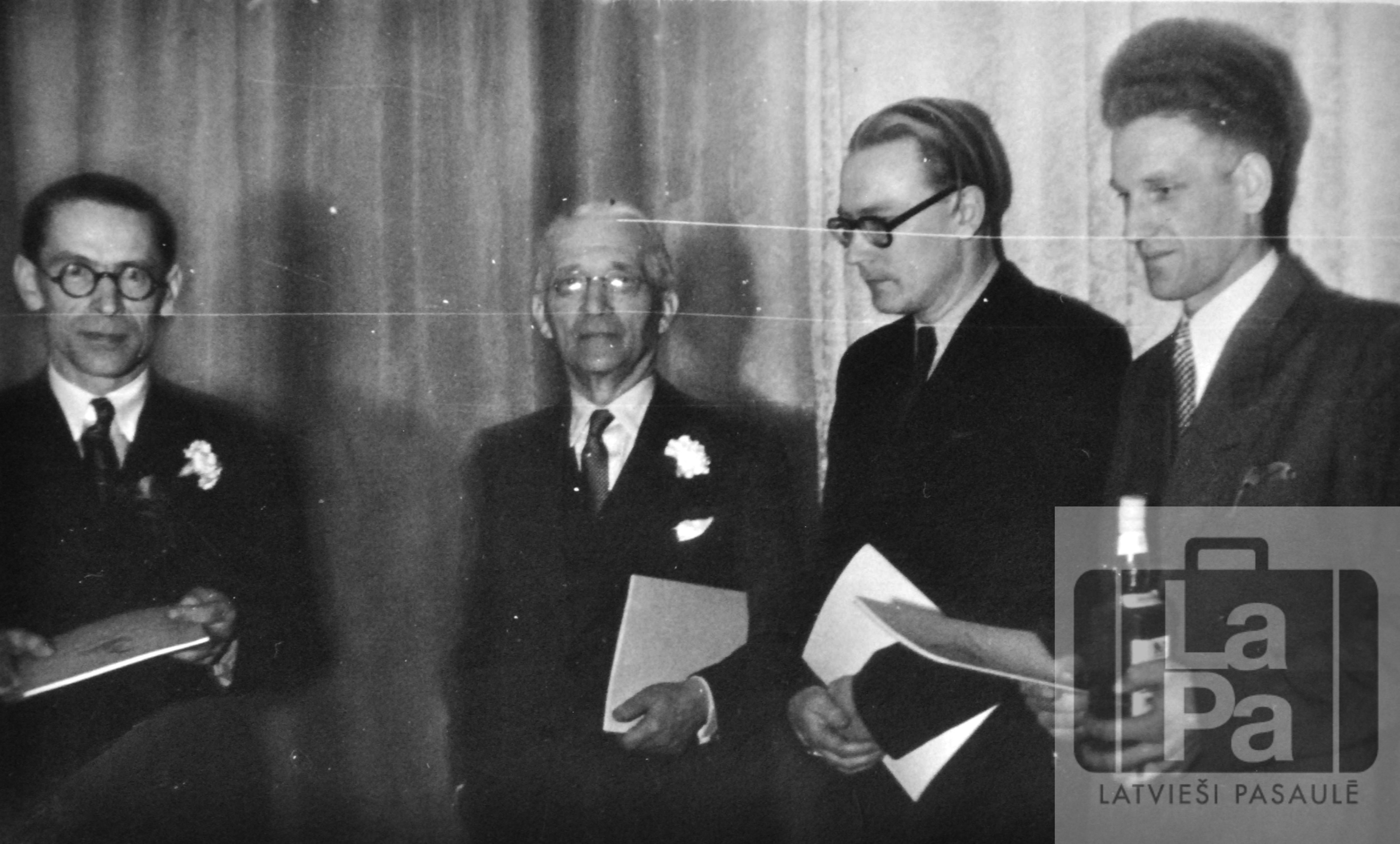 Dziesmu dienās Anglijā. No kreisās: Daumants Vītols, Latvijas diplomātiskā un konsulārā dienesta vadītājs Kārlis Zariņš, Alberts Jērums, nezināms.