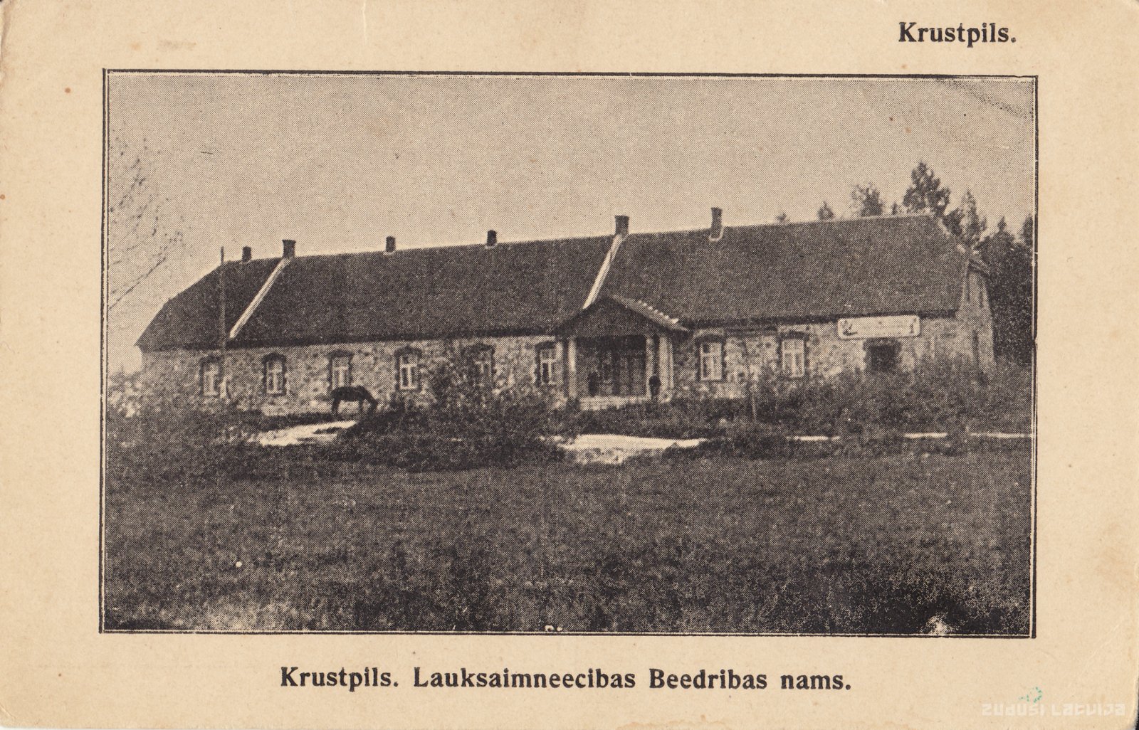 Atklātnes frontālajā pusē uzraksts: Krustpils. Lauksaimneecibas Beedribas nams