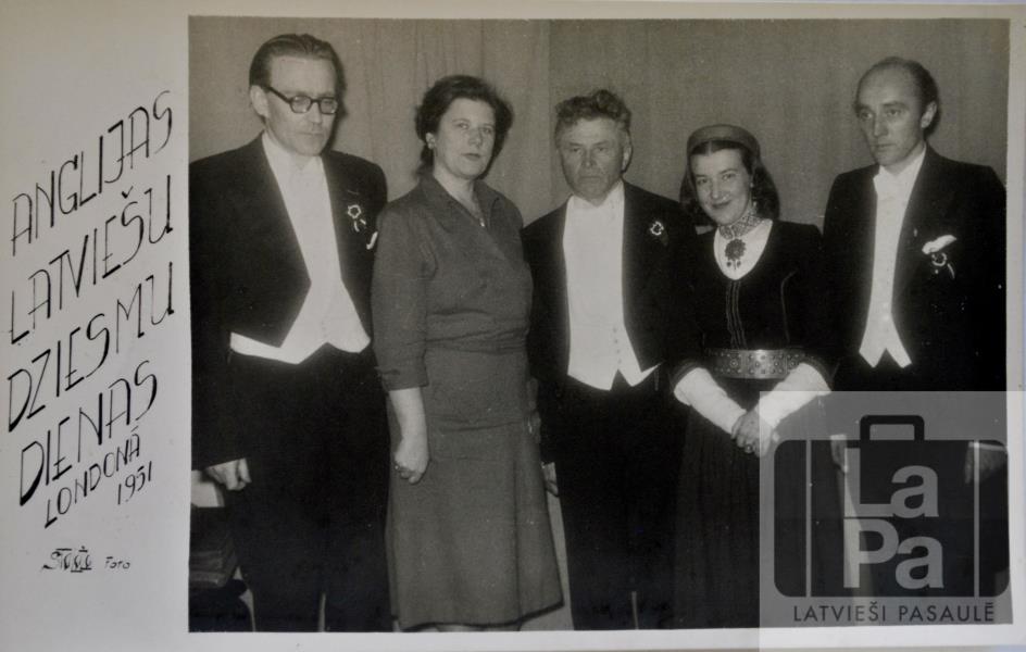 Diriģenti un solisti Anglijas latviešu Dziesmu dienās Londonā 1951. gadā. No kreisās: Alberts Jērums, Marija Vintere, Teodors Reiters, Gaida Trēziņa, Roberts Zuika.