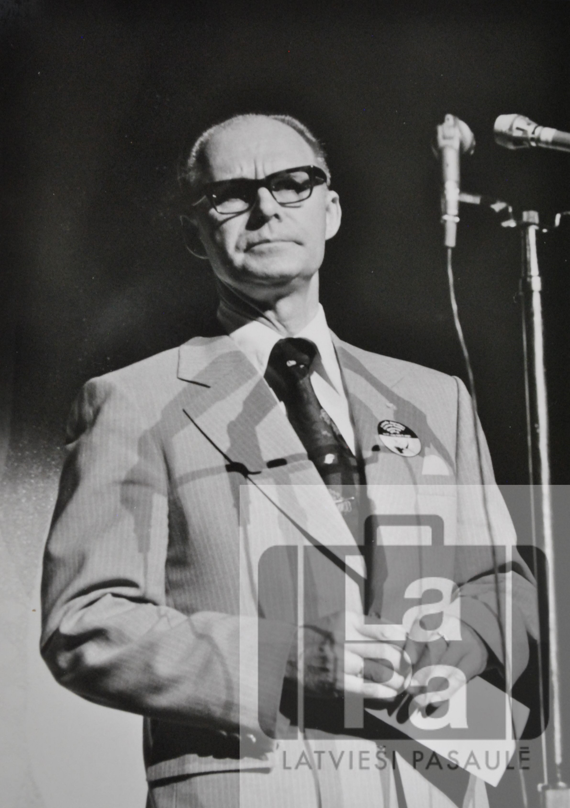 Jānis Mežaks uzrunā publiku Latviešu jaunatnes dziesmu svētkos Monreālā