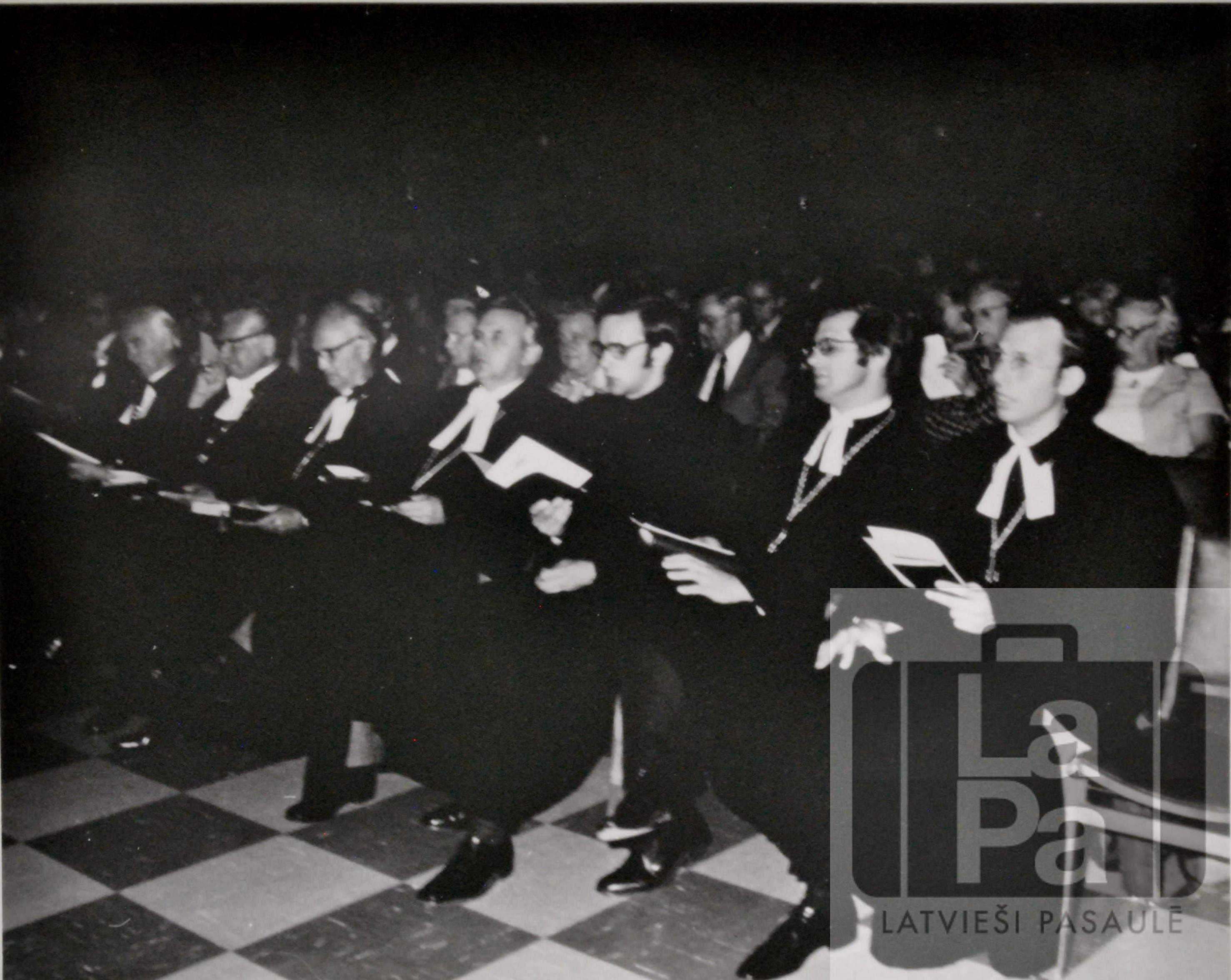 Jaunie latviešu mācītāji svētku dievkalpojumā Latviešu jaunatnes dziesmu svētkos Redpath Hall, Makgila Universitātē (McGill University) Monreālā.