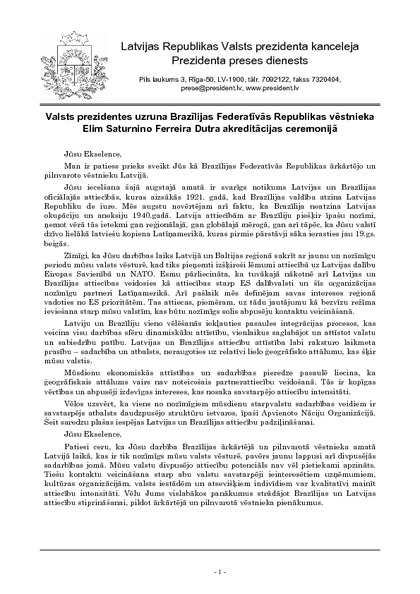 Valsts prezidentes uzruna Brazīlijas Federatīvās Republikas vēstnieka Elim Saturnino Ferreira Dutra akreditācijas ceremonijā