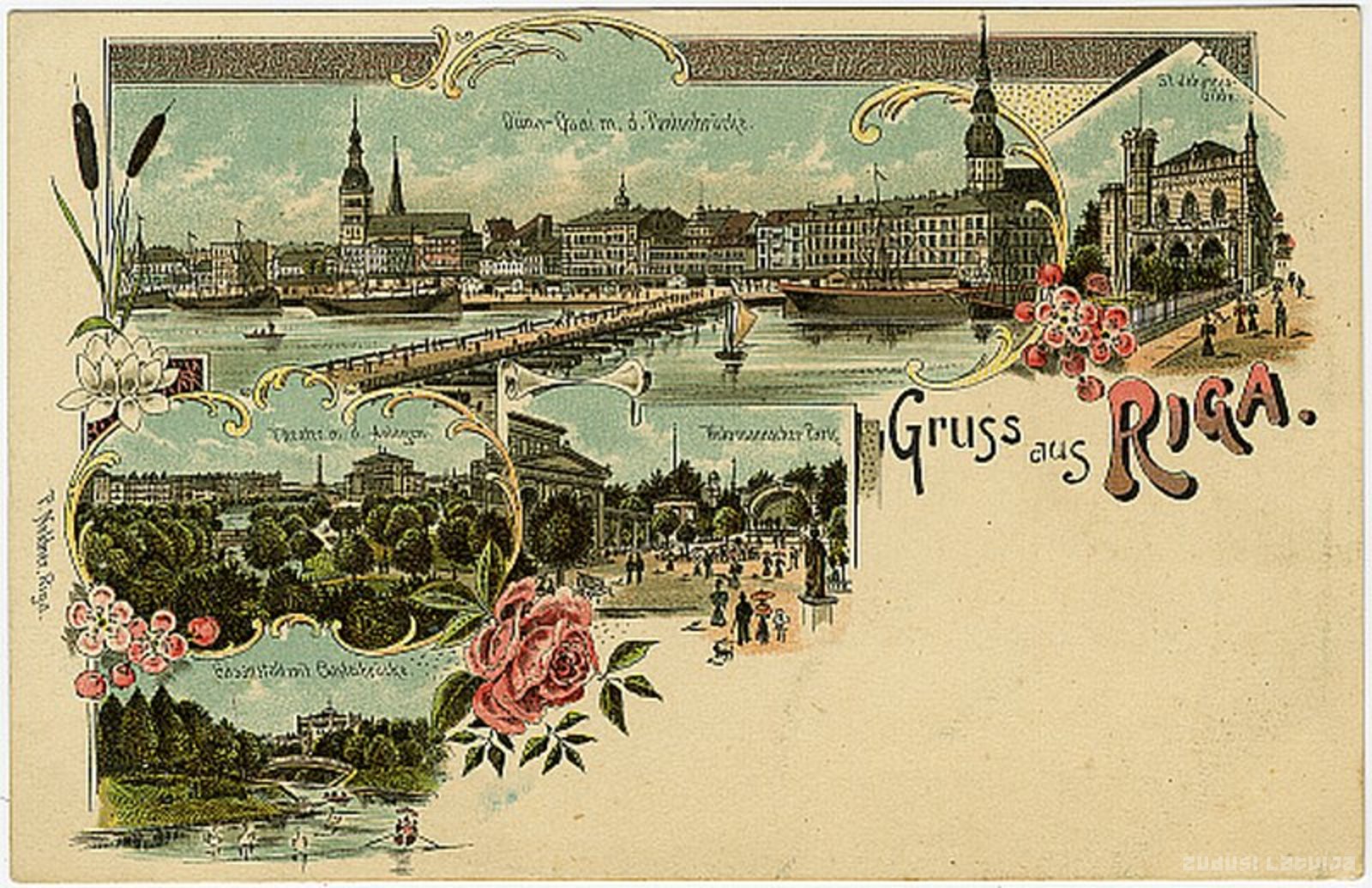 Kolāža no 5 attēliem: Daugavas krastmala ar pontontiltu, Sv.Jāņa ģilde, Rīgas pilsētas teātris ar apstādījumiem, Vērmaņa parks, Gāzes iestāde ar tiltu pie Bastejkalna