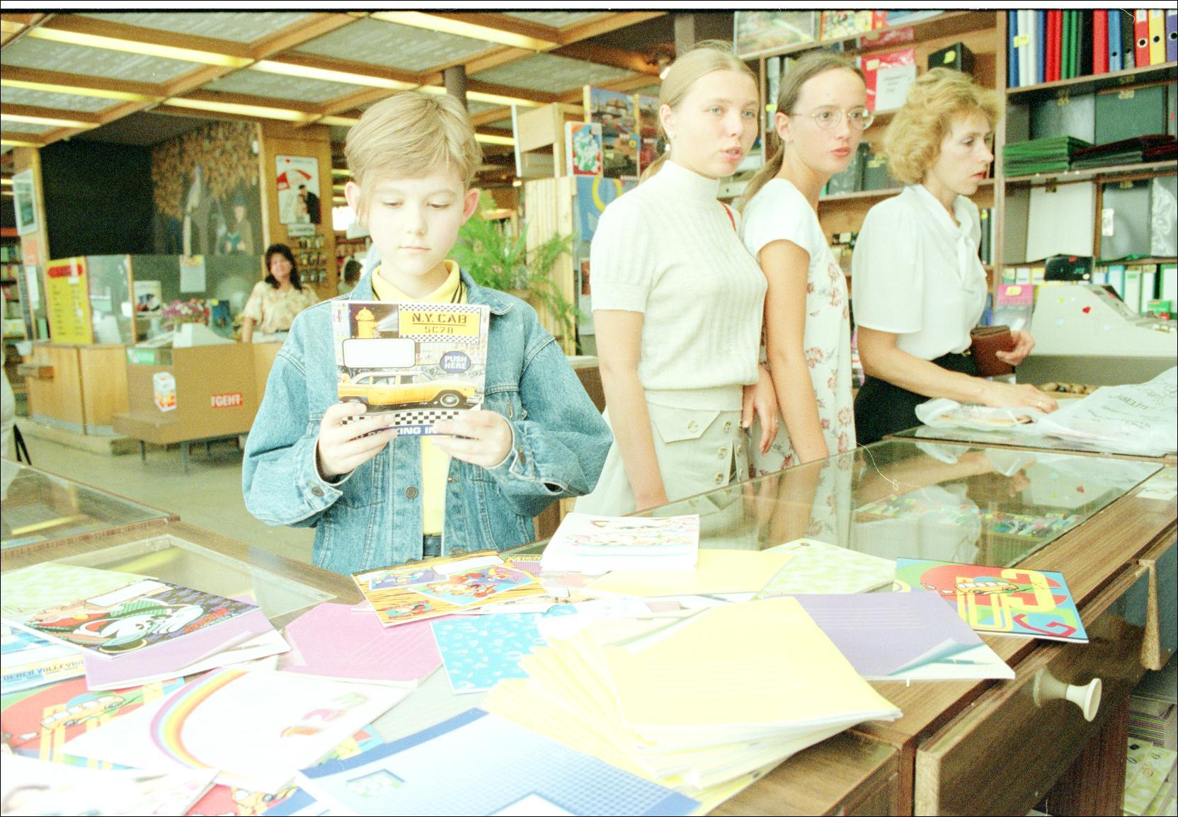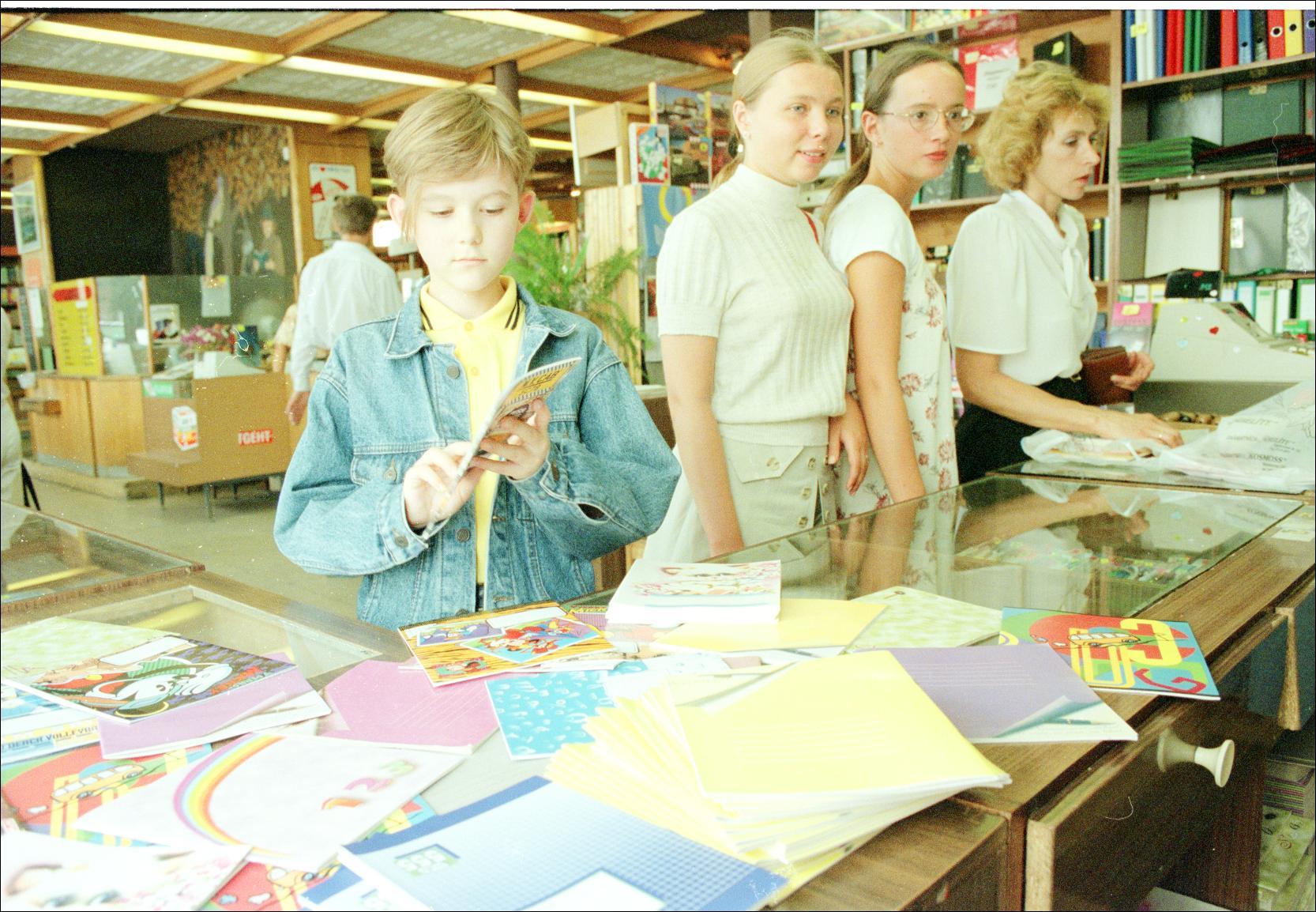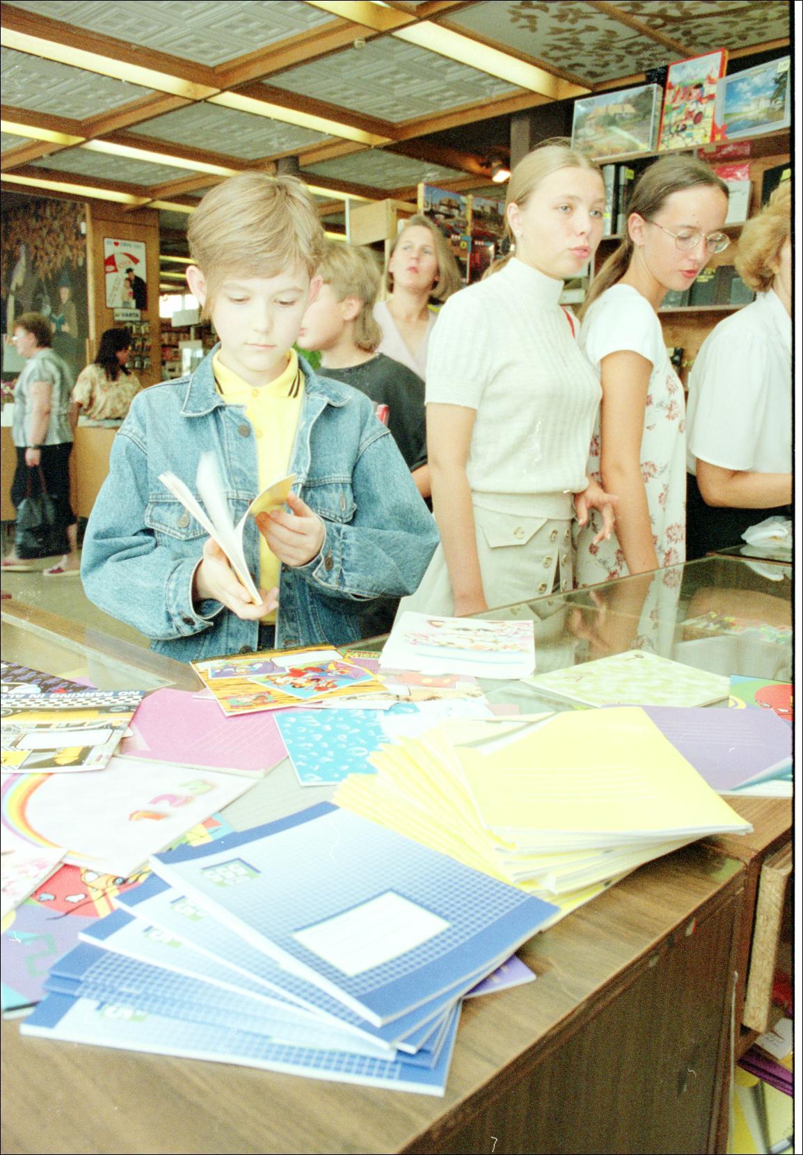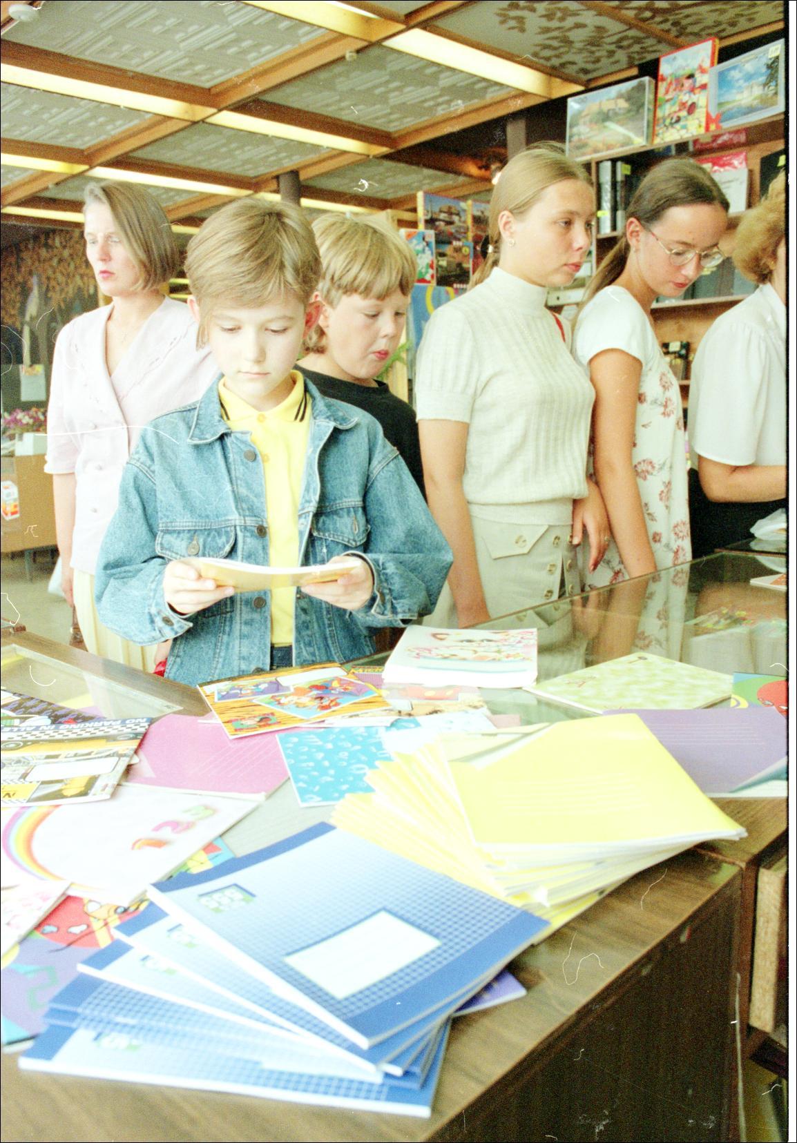 Daiga Štālberga «Saules raksti»,āboli, skolēni pērk burtnīcas veikalā «Ābelīte».