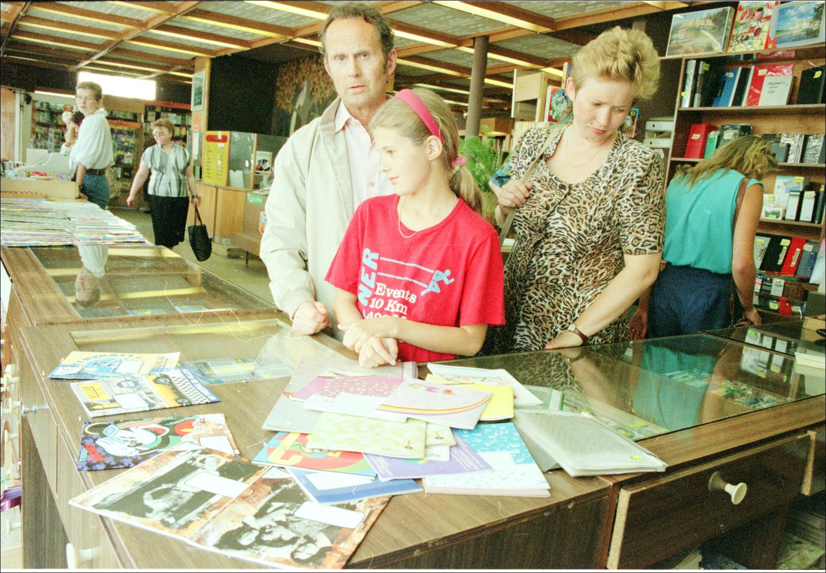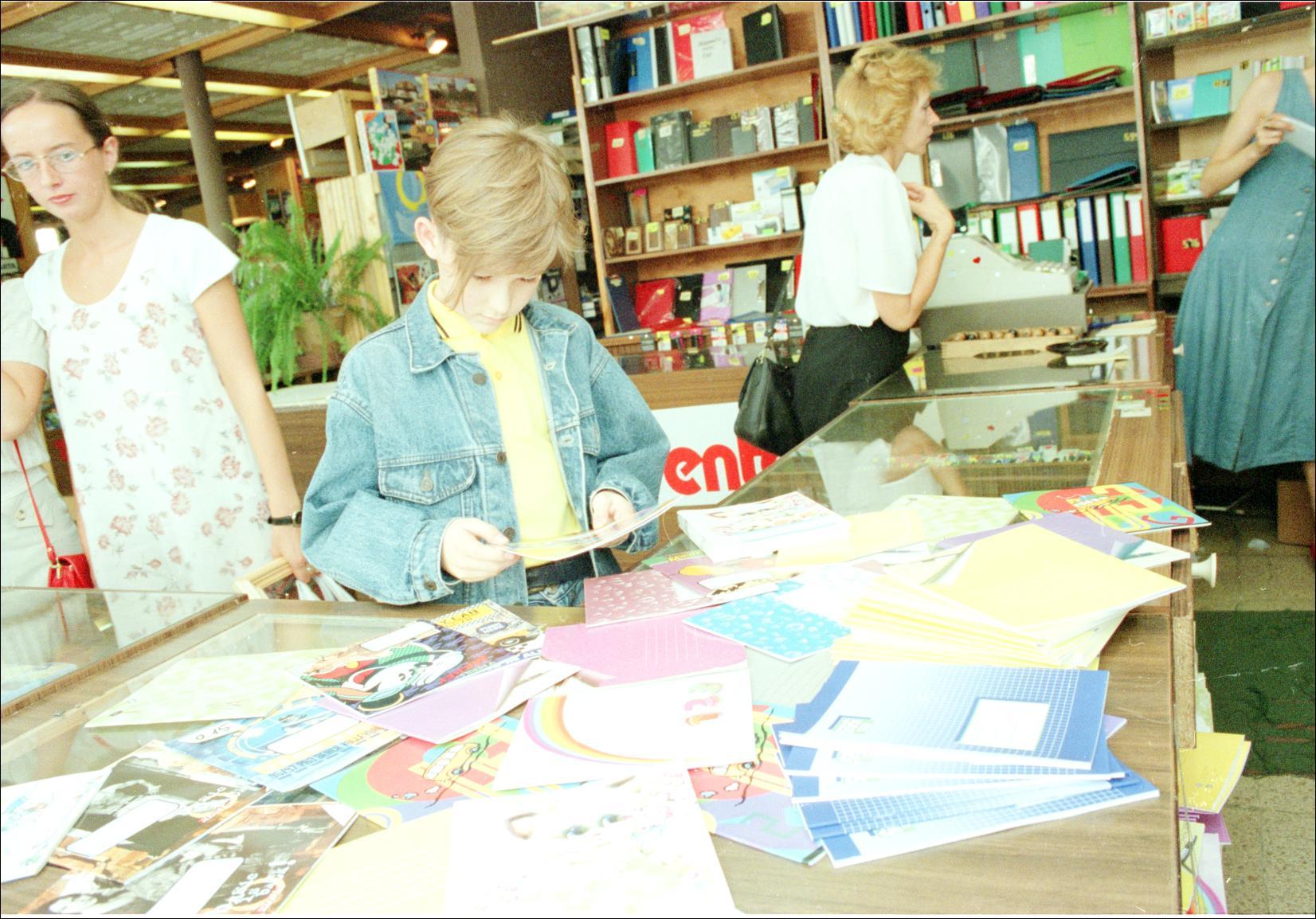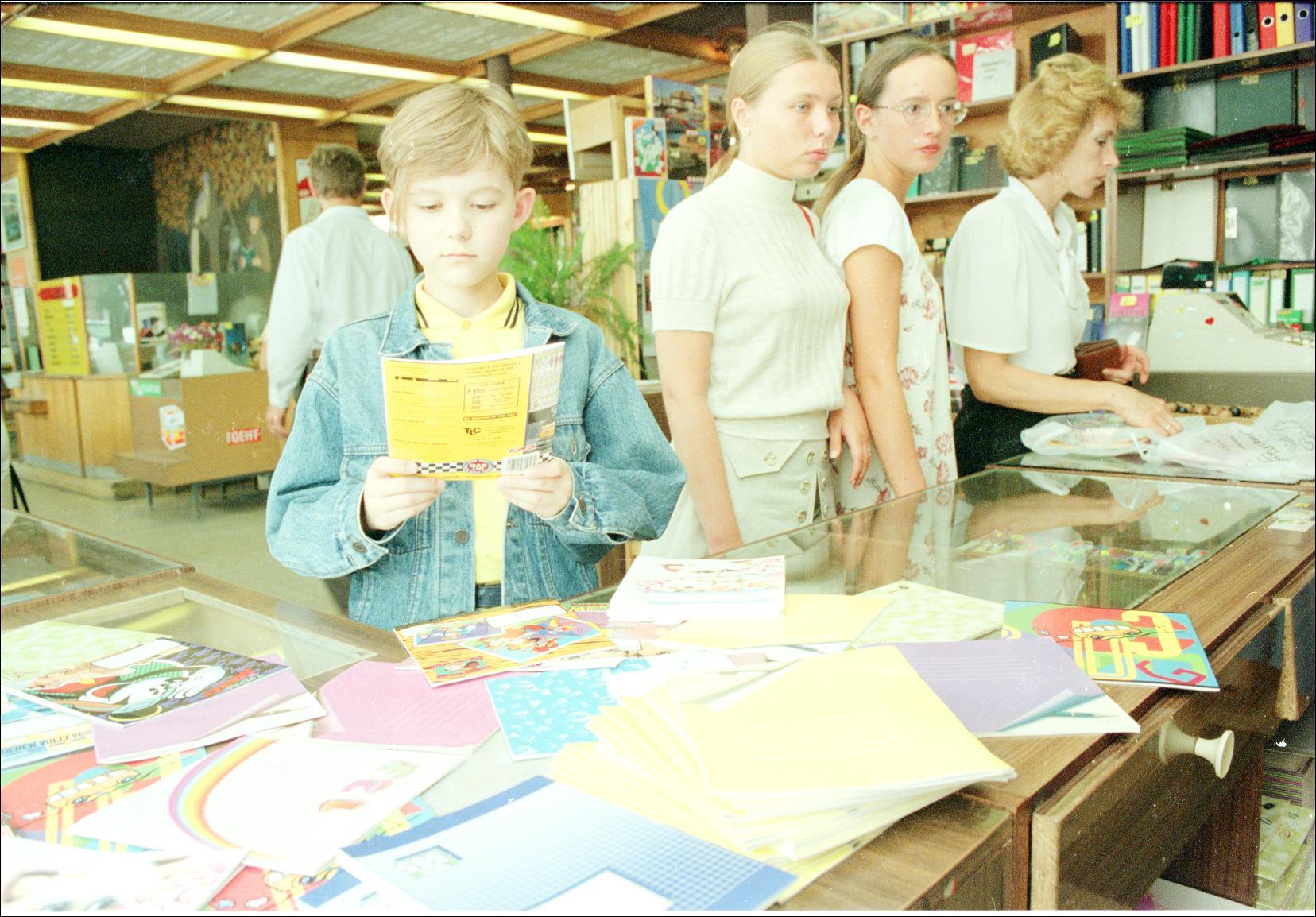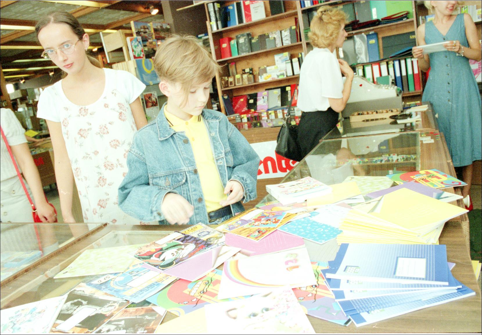 Daiga Štālberga «Saules raksti»,āboli, skolēni pērk burtnīcas veikalā «Ābelīte».
