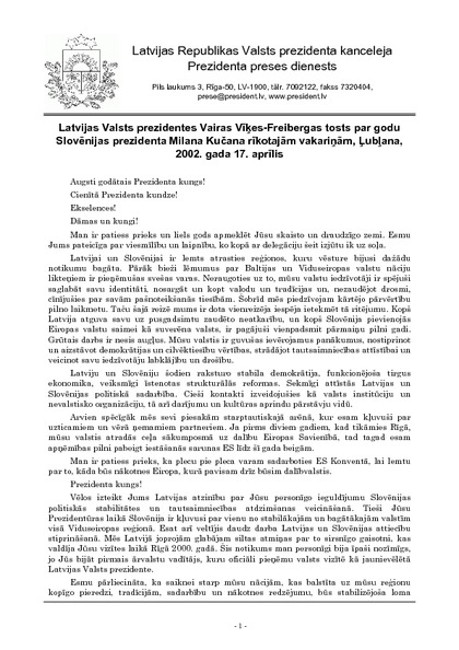 Latvijas Valsts prezidentes Vairas Vīķes-Freibergas tosts par godu Slovēnijas prezidenta Milana Kučana rīkotajām vakariņām, Ļubļana, 2002. gada 17. aprīlis