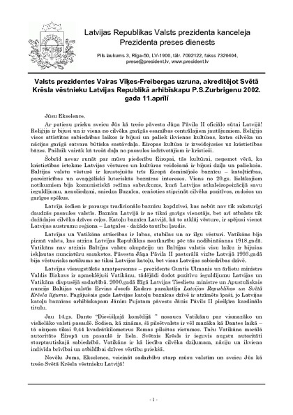 Valsts prezidentes Vairas Vīķes-Freibergas uzruna, akreditējot Svētā Krēsla vēstnieku Latvijas Republikā arhibīskapu P.S.Zurbrigenu 2002. gada 11.aprīlī
