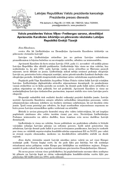 Valsts prezidentes Vairas Vīķes- Freibergas uzruna, akreditējot Apvienotās Karalistes ārkārtējo un pilnvaroto vēstnieku Latvijas Republikā Endrjū Tizorjē