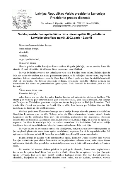 Valsts prezidentes apsveikuma runa Jūras spēku 10.gadadienā Latviešu biedrības namā, 2002.gada 12.aprīlī